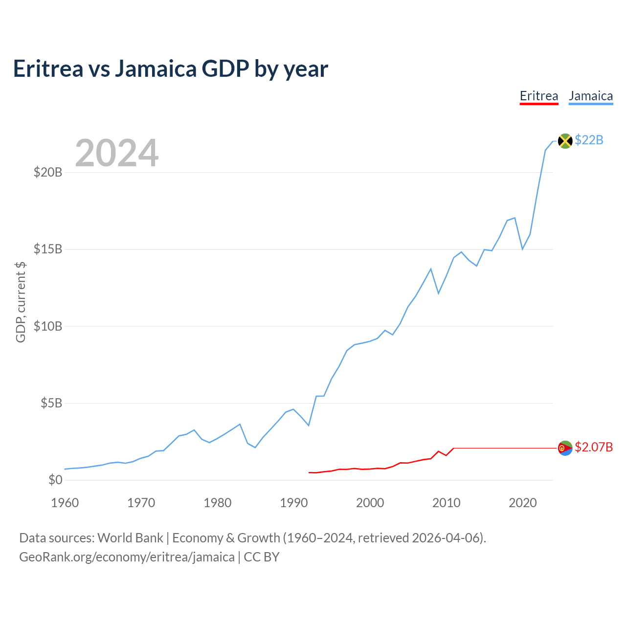 Eritrea has a GDP of $2.07B compared to $22B for Jamaica, ranking 179/197 and 124/197 by economy size, respectively.