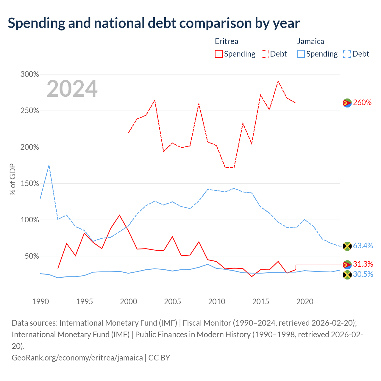 Eritrea has $3.54B in government debt (260.4% of GDP), compared to $14B (63.4% of GDP) in Jamaica.