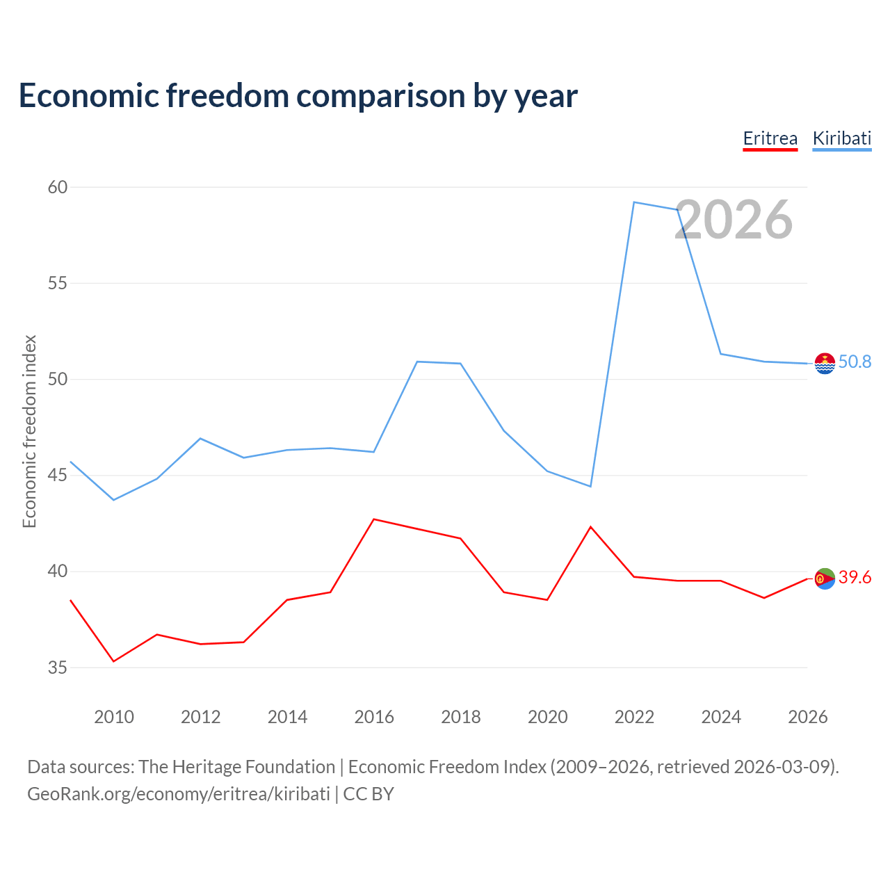 The Economic Freedom Index for Eritrea is 39.6, ranking 188/197, compared to 50.8 for Kiribati, ranking 158/197. The chart above displays a comparison of annual changes in economic freedom indexes.