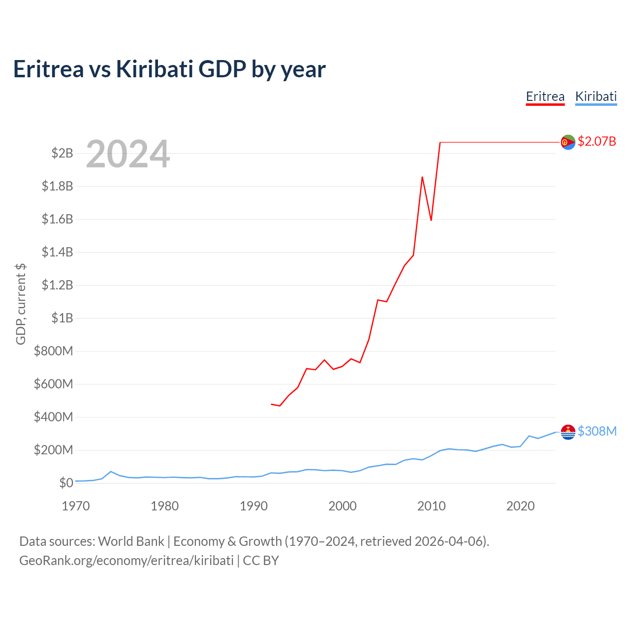 Eritrea has a GDP of $2.07B compared to $308M for Kiribati, ranking 179/197 and 192/197 by economy size, respectively.