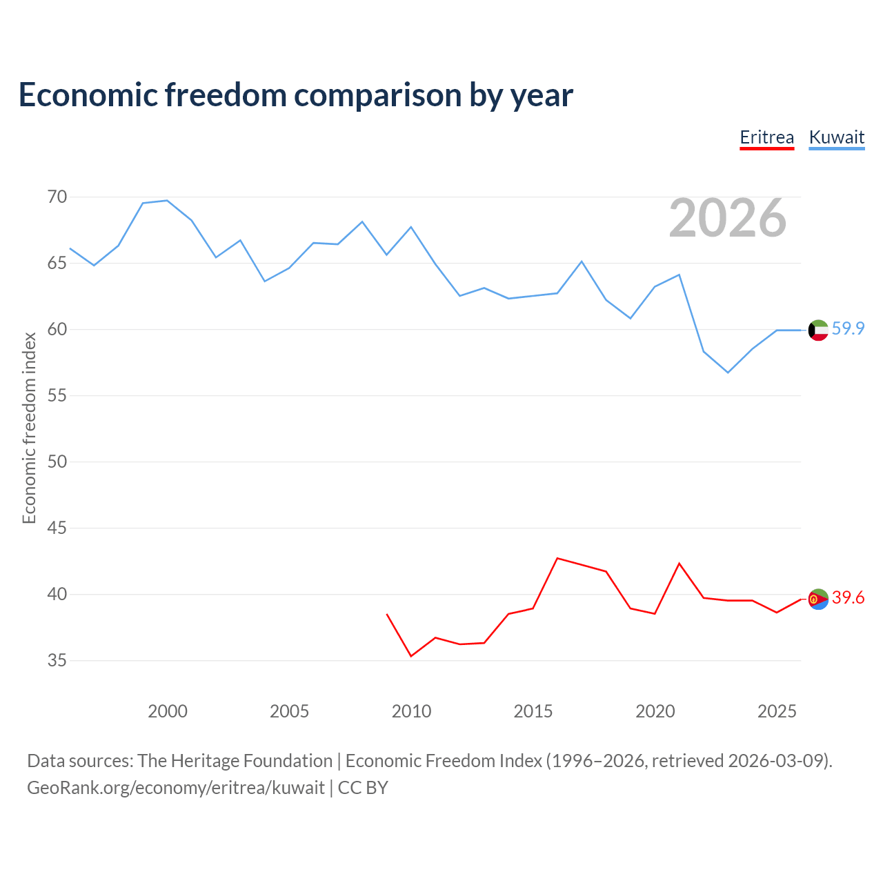 The Economic Freedom Index for Eritrea is 39.6, ranking 188/197, compared to 59.9 for Kuwait, ranking 100/197. The chart above displays a comparison of annual changes in economic freedom indexes.