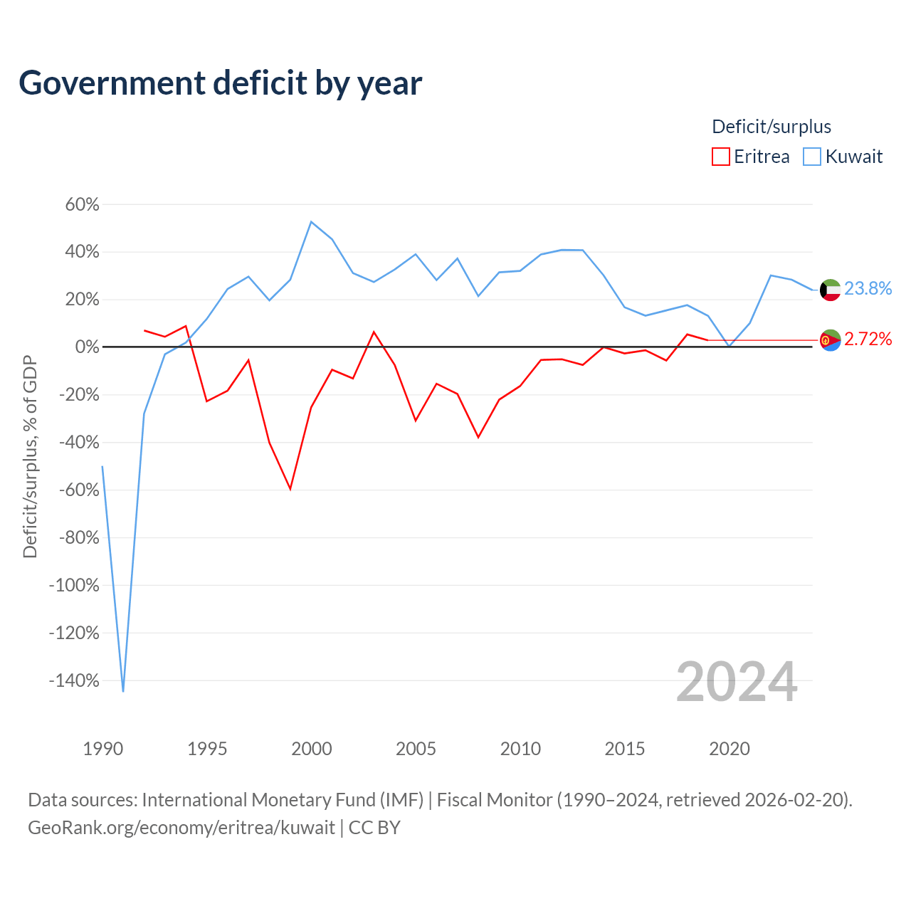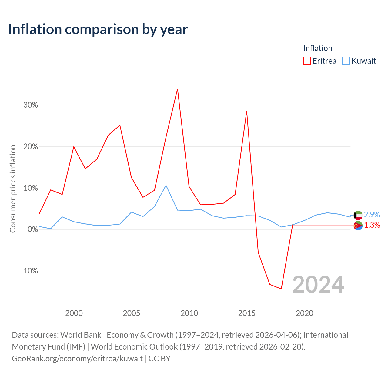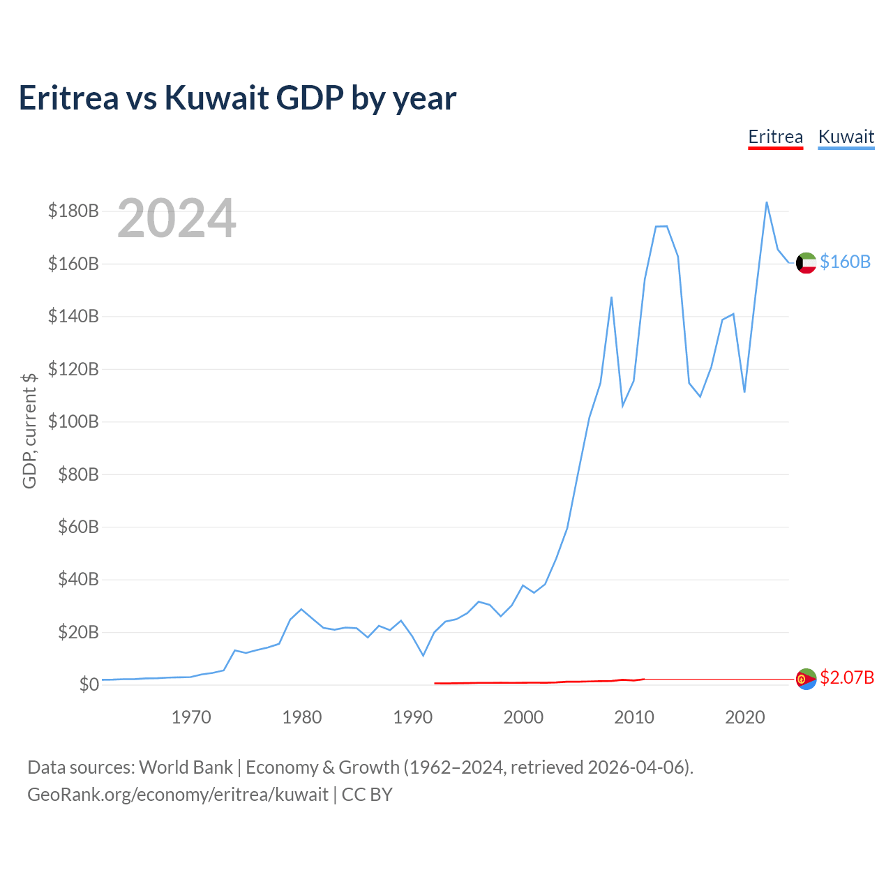 Eritrea has a GDP of $2.07B compared to $160B for Kuwait, ranking 179/197 and 59/197 by economy size, respectively.
