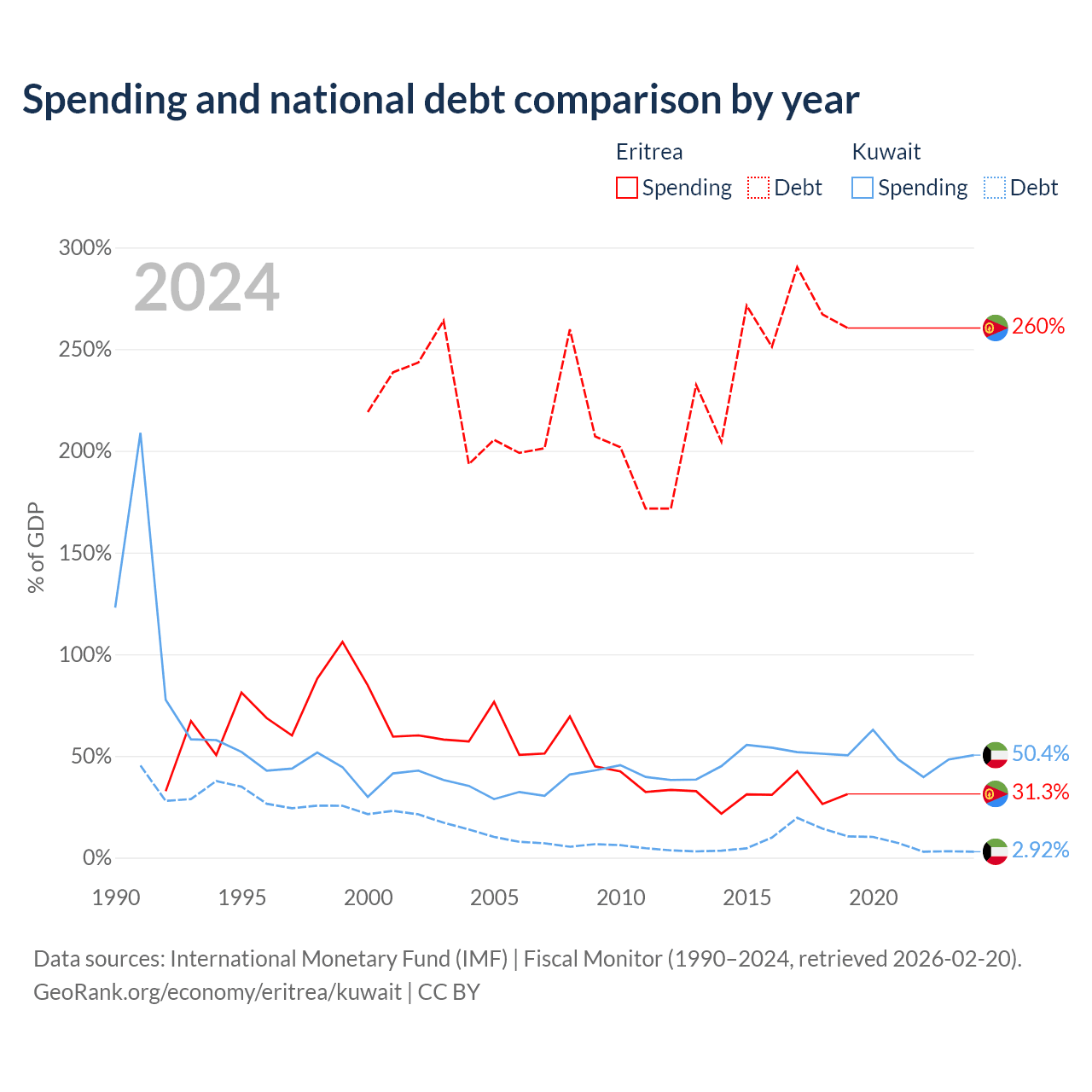 Eritrea has $3.54B in government debt (260.4% of GDP), compared to $4.68B (2.92% of GDP) in Kuwait.