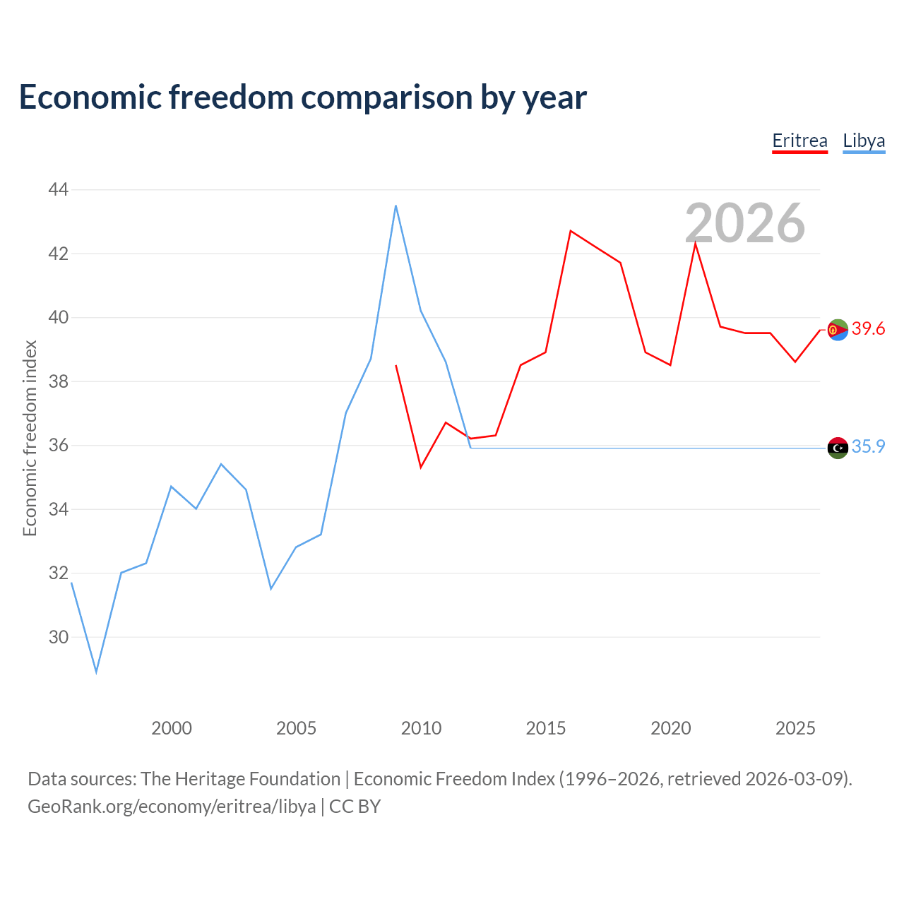Data sources: The Heritage Foundation | Economic Freedom Index (1996–2026, retrieved 2026-03-09).