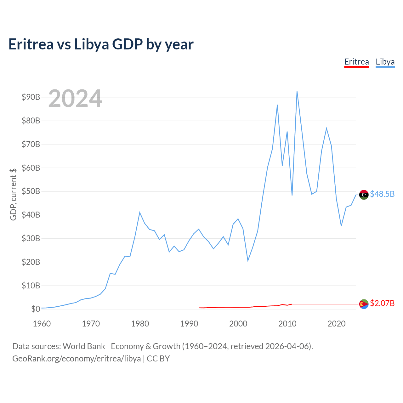 Eritrea has a GDP of $2.07B compared to $48.5B for Libya, ranking 179/197 and 95/197 by economy size, respectively.