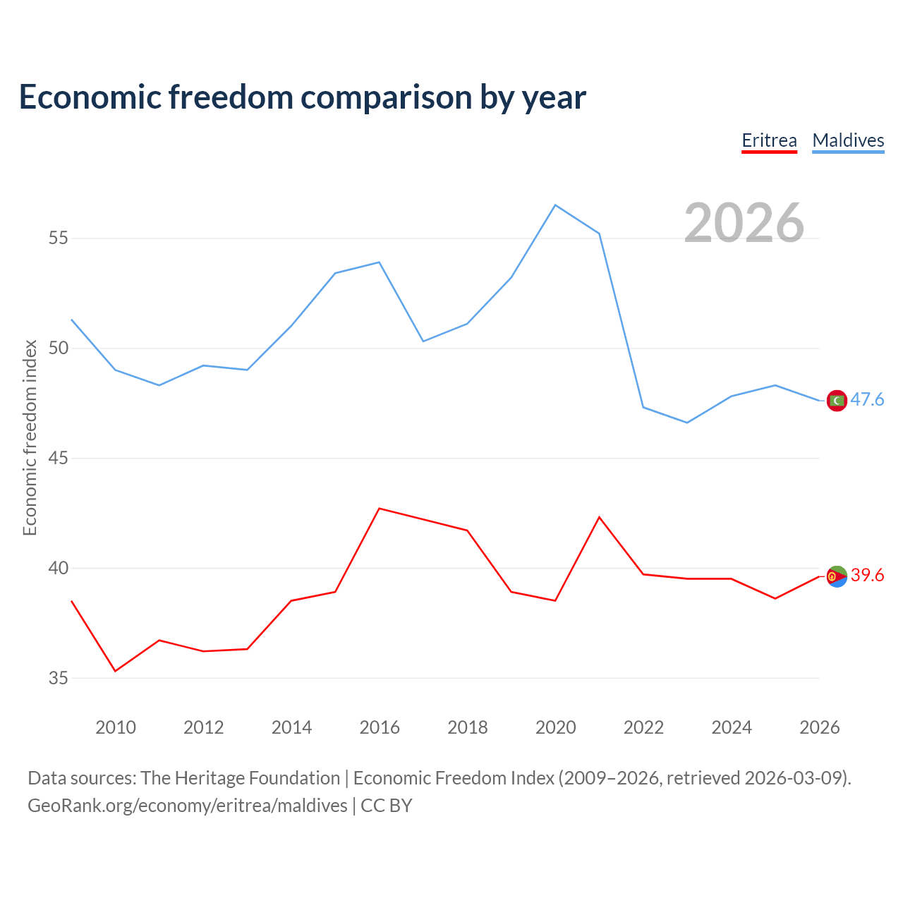 The Economic Freedom Index for Eritrea is 39.6, ranking 188/197, compared to 47.6 for Maldives, ranking 174/197. The chart above displays a comparison of annual changes in economic freedom indexes.