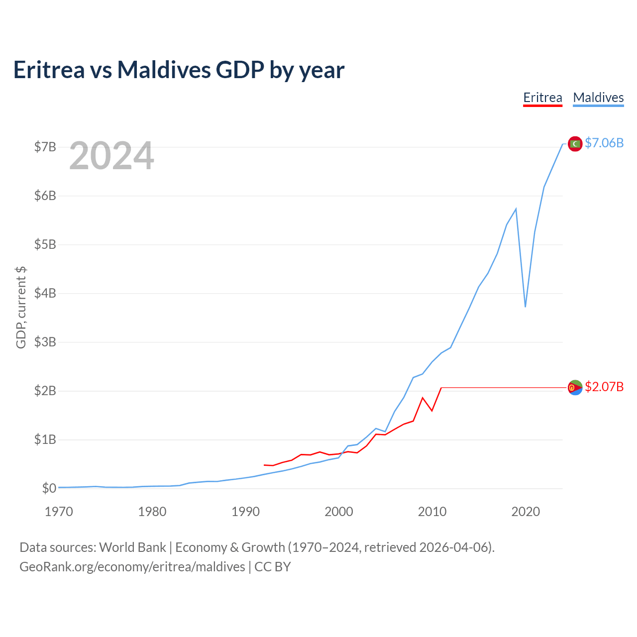 Eritrea has a GDP of $2.07B compared to $7.06B for Maldives, ranking 179/197 and 159/197 by economy size, respectively.