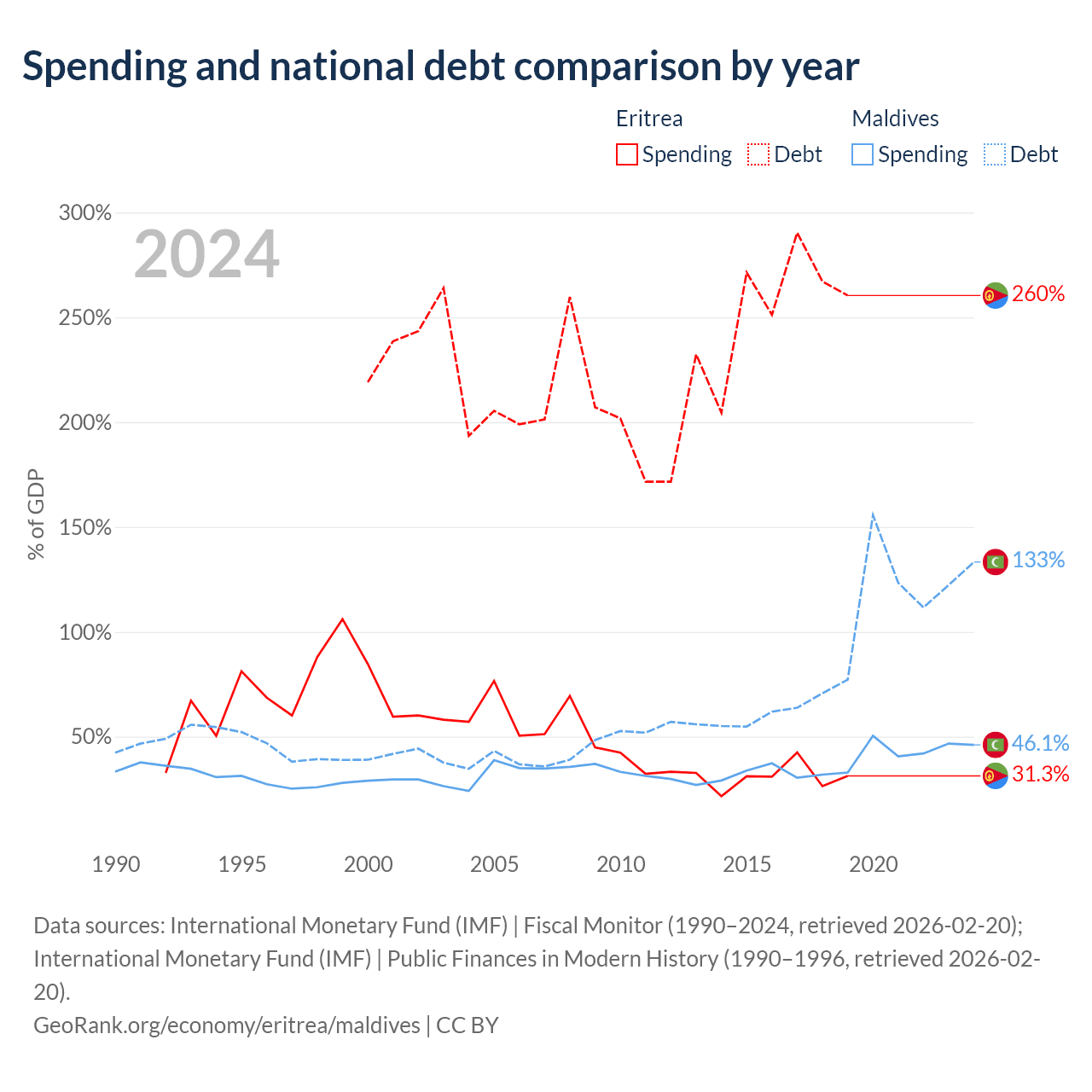 Eritrea has $3.54B in government debt (260.4% of GDP), compared to $9.41B (133.3% of GDP) in Maldives.