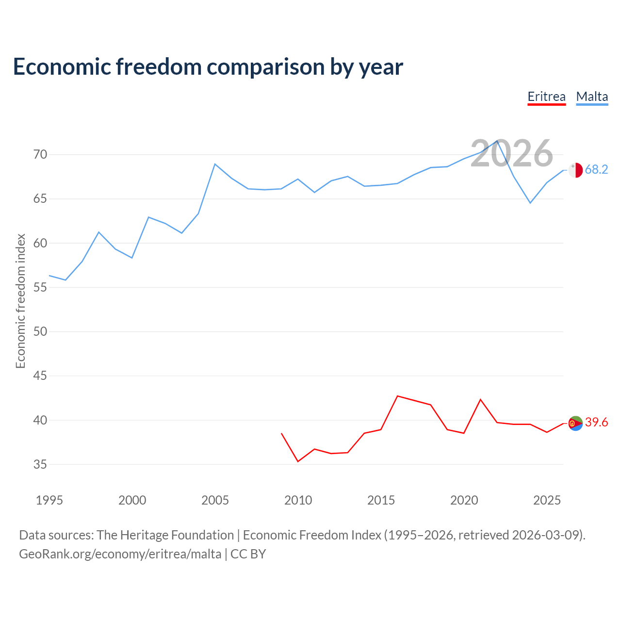 The Economic Freedom Index for Eritrea is 39.6, ranking 188/197, compared to 68.2 for Malta, ranking 49/197. The chart above displays a comparison of annual changes in economic freedom indexes.