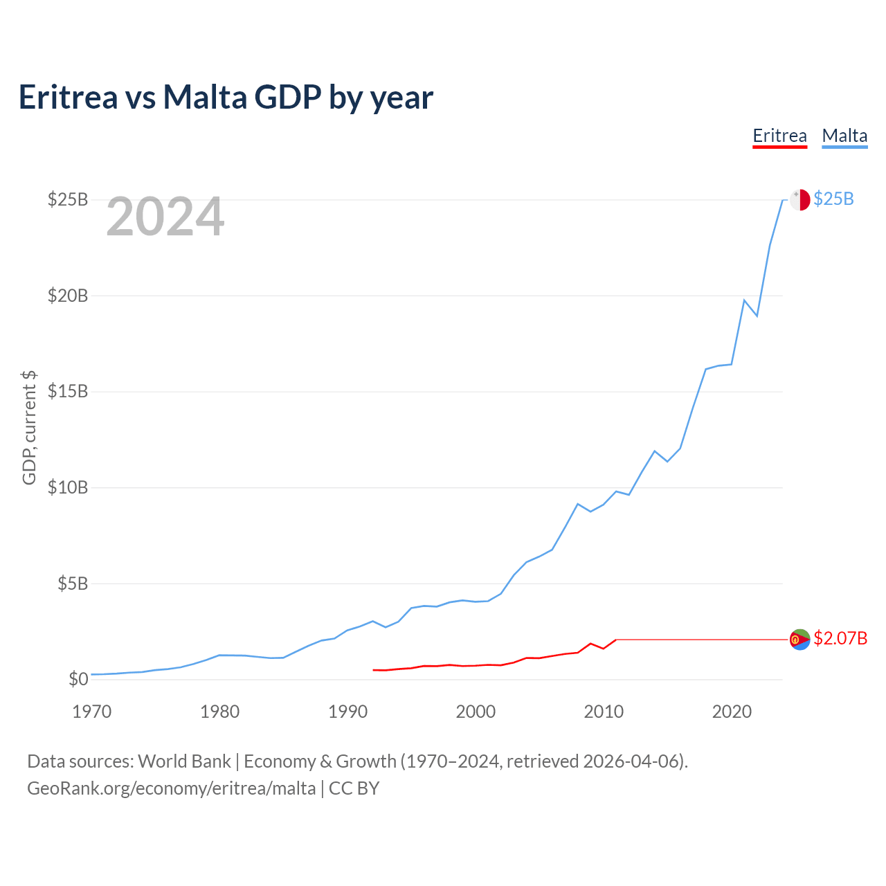 Eritrea has a GDP of $2.07B compared to $25B for Malta, ranking 179/197 and 119/197 by economy size, respectively.