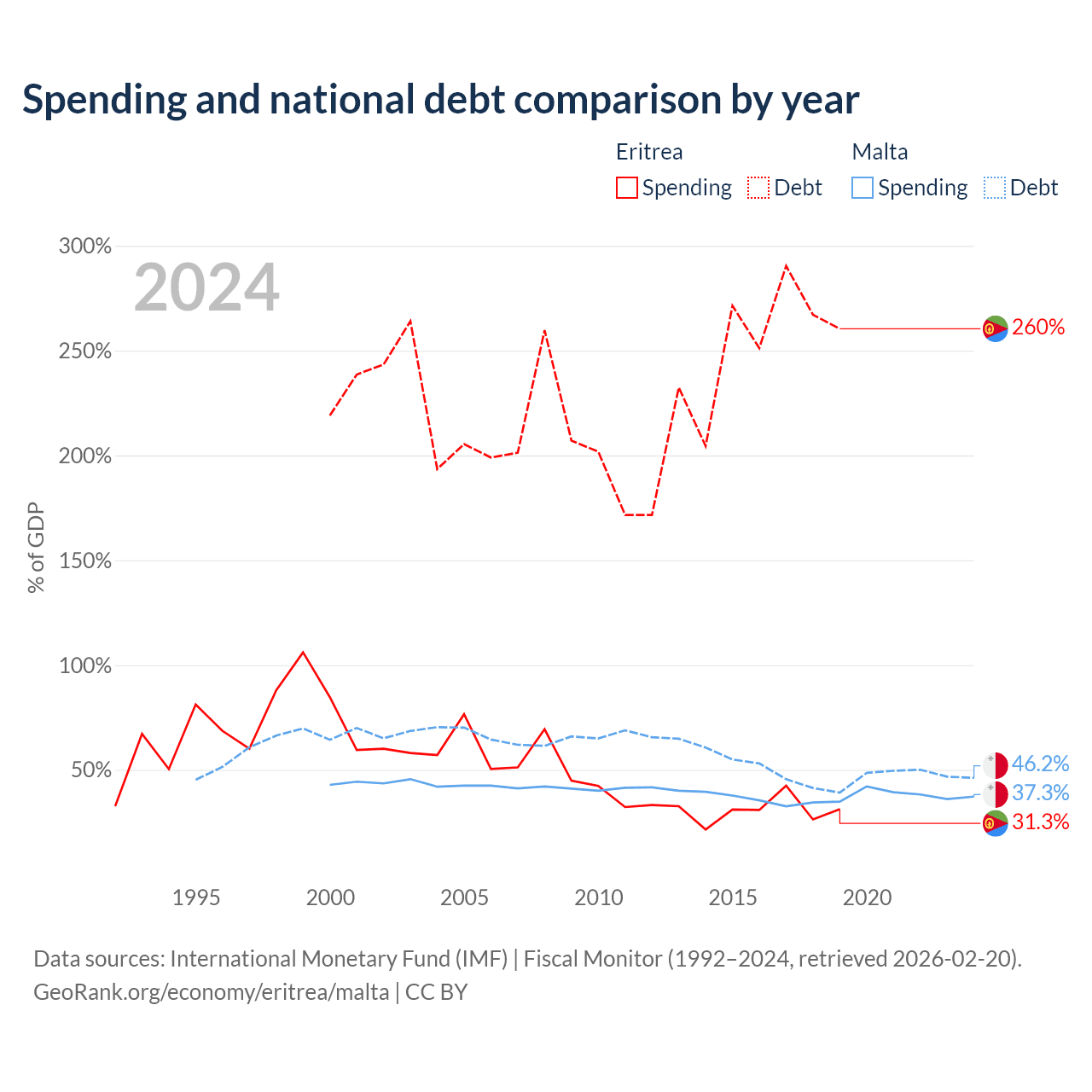 Eritrea has $3.54B in government debt (260.4% of GDP), compared to $11.5B (46.2% of GDP) in Malta.