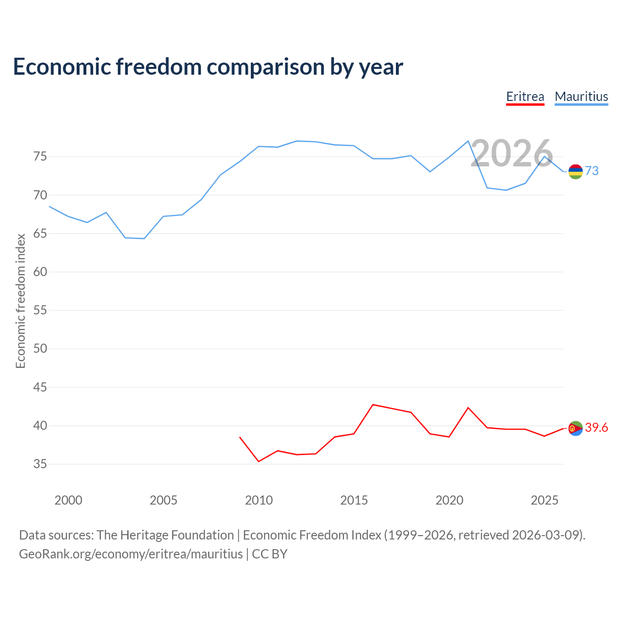The Economic Freedom Index for Eritrea is 39.6, ranking 188/197, compared to 73 for Mauritius, ranking 26/197. The chart above displays a comparison of annual changes in economic freedom indexes.