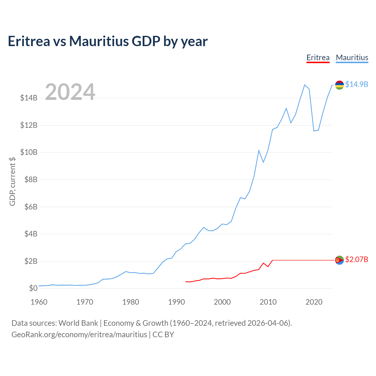 Eritrea has a GDP of $2.07B compared to $14.9B for Mauritius, ranking 179/197 and 143/197 by economy size, respectively.