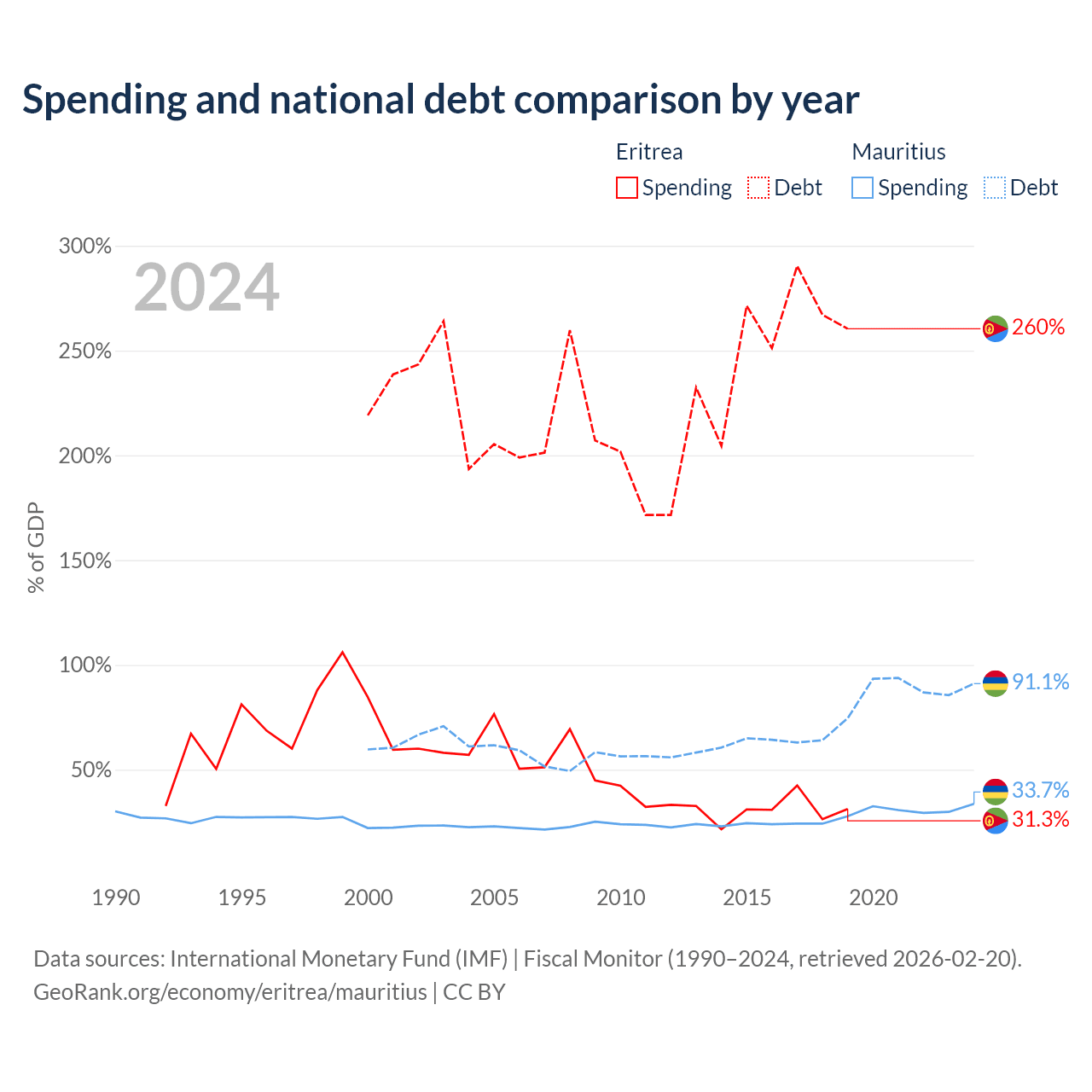 Eritrea has $3.54B in government debt (260.4% of GDP), compared to $13.6B (91.1% of GDP) in Mauritius.