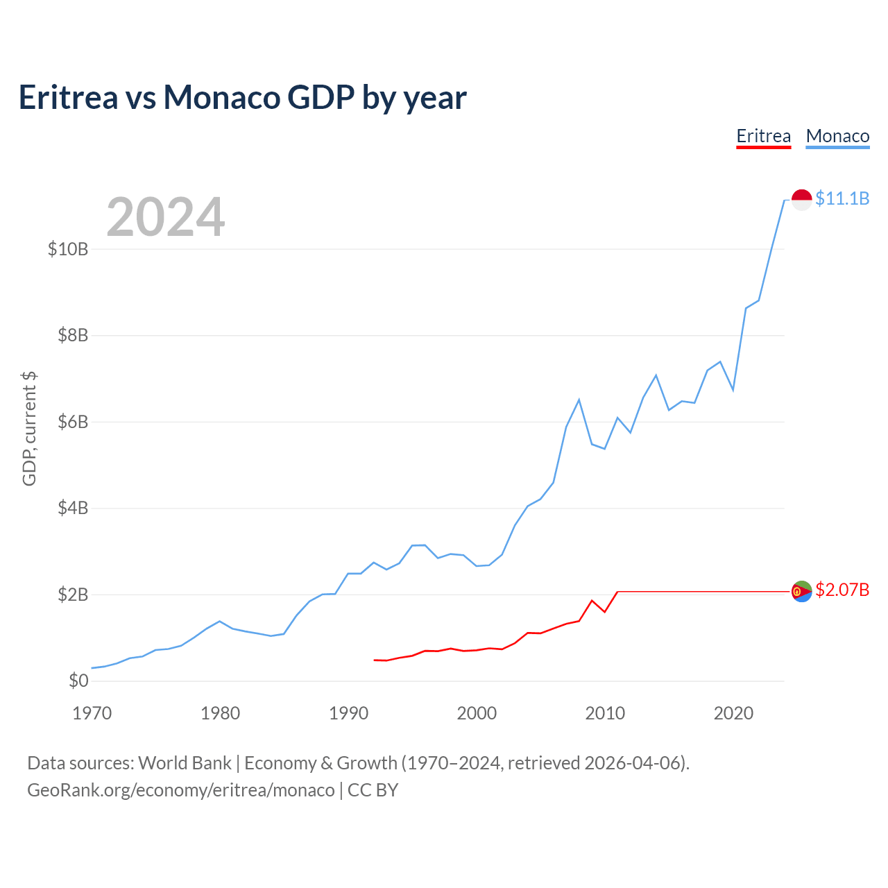 Eritrea has a GDP of $2.07B compared to $11.1B for Monaco, ranking 179/197 and 152/197 by economy size, respectively.