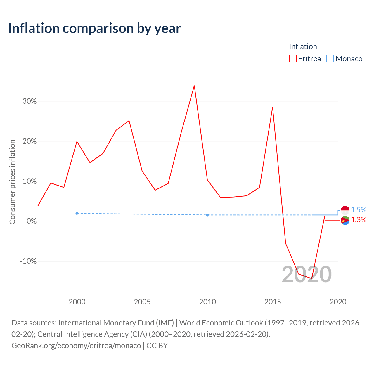 Over the past 20 years, Eritrea has recorded an average annual inflation rate of 10.9%, compared with 1.6% in Monaco. In 2019, inflation was 1.3% in Eritrea and 1.5% in Monaco.