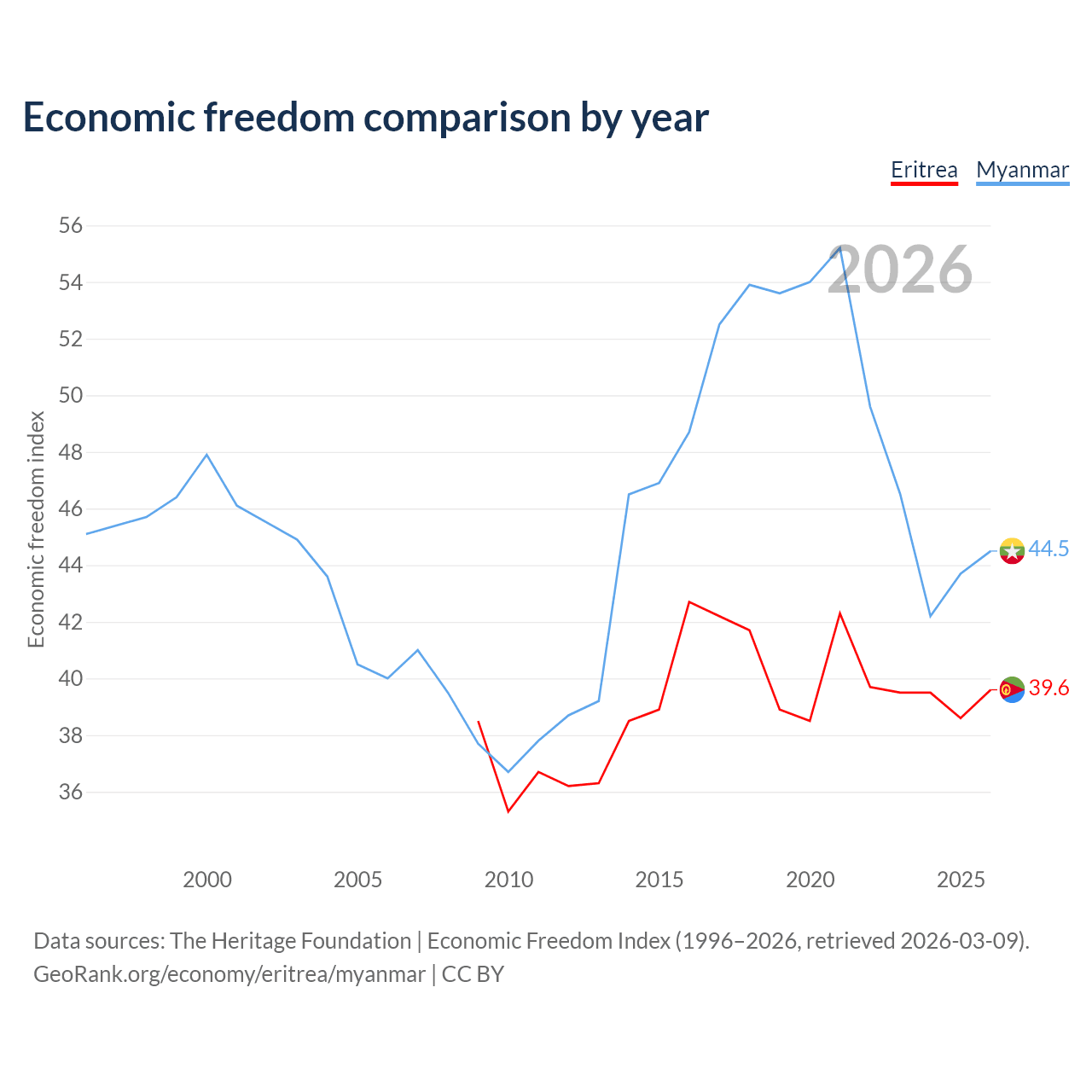 The Economic Freedom Index for Eritrea is 39.6, ranking 188/197, compared to 44.5 for Myanmar, ranking 180/197. The chart above displays a comparison of annual changes in economic freedom indexes.