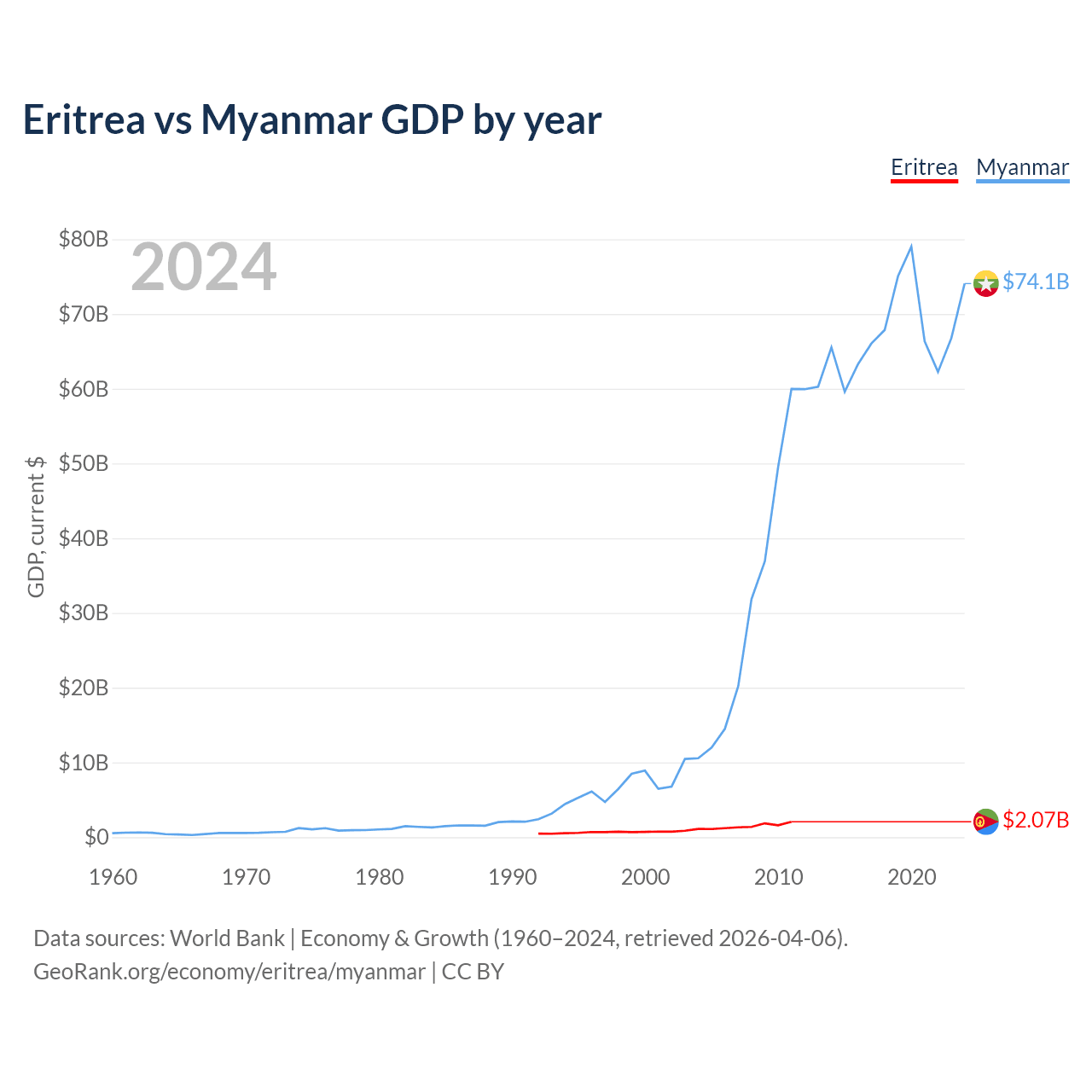 Eritrea has a GDP of $2.07B compared to $74.1B for Myanmar, ranking 179/197 and 85/197 by economy size, respectively.