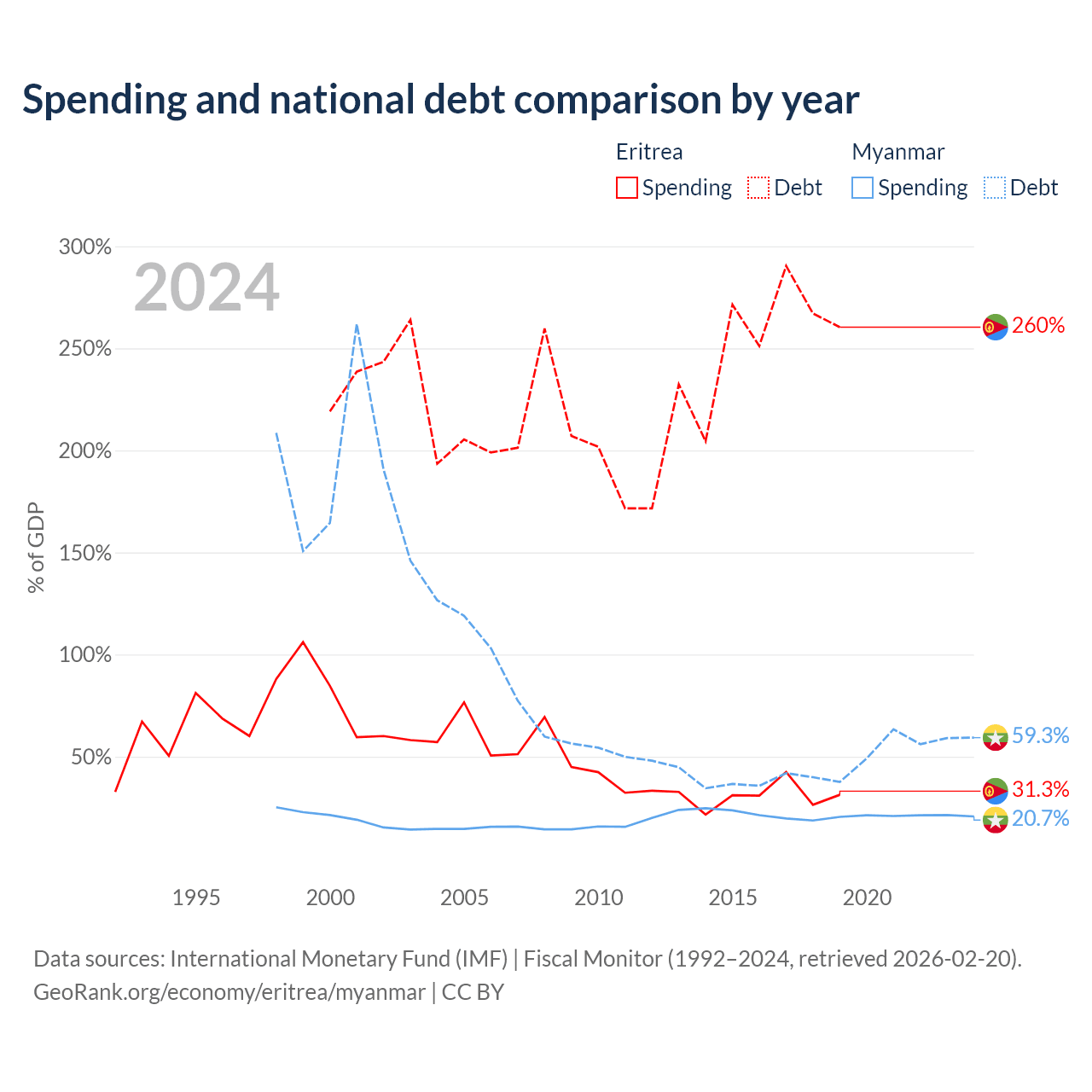 Eritrea has $3.54B in government debt (260.4% of GDP), compared to $44B (59.3% of GDP) in Myanmar.