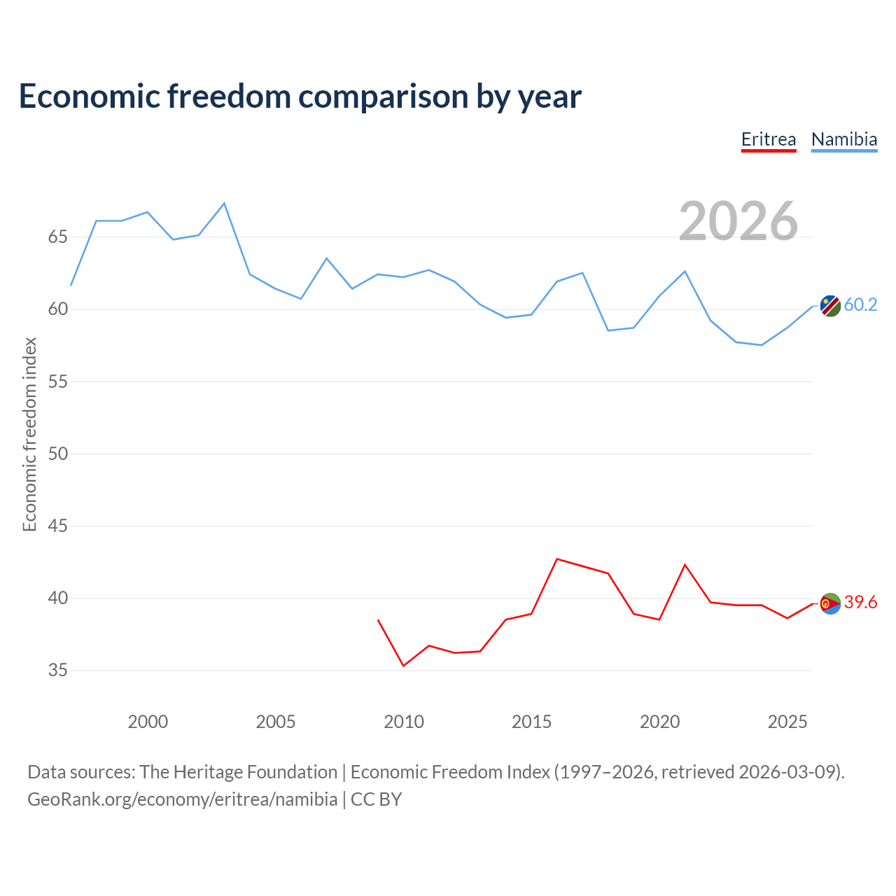 The Economic Freedom Index for Eritrea is 39.6, ranking 188/197, compared to 60.2 for Namibia, ranking 95/197. The chart above displays a comparison of annual changes in economic freedom indexes.