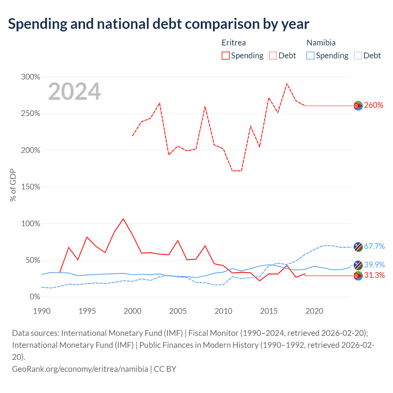 Eritrea has $3.54B in government debt (260.4% of GDP), compared to $9.05B (67.7% of GDP) in Namibia.