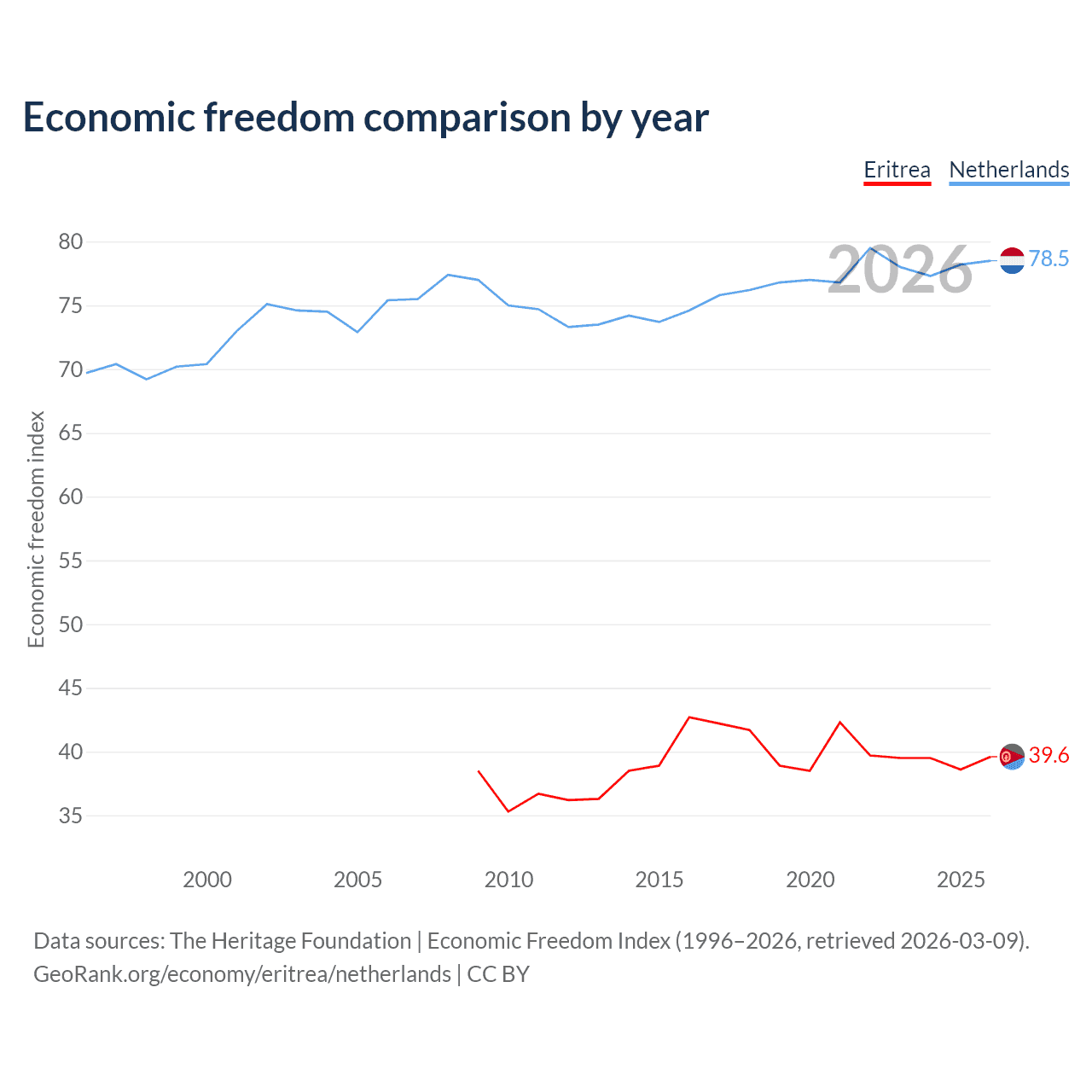 The Economic Freedom Index for Eritrea is 39.6, ranking 188/197, compared to 78.5 for the Netherlands, ranking 11/197. The chart above displays a comparison of annual changes in economic freedom indexes.