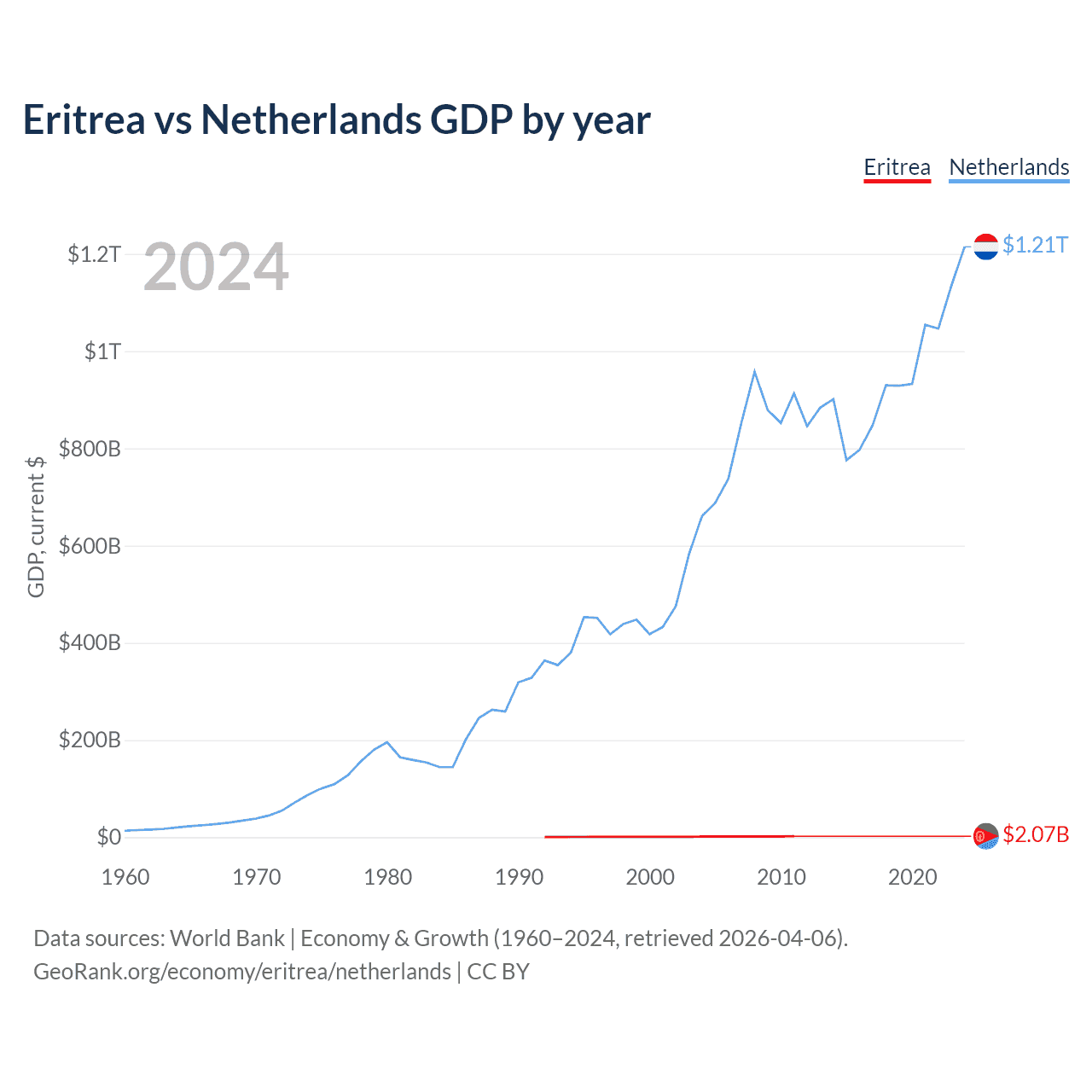 Eritrea has a GDP of $2.07B compared to $1.21T for the Netherlands, ranking 179/197 and 19/197 by economy size, respectively.