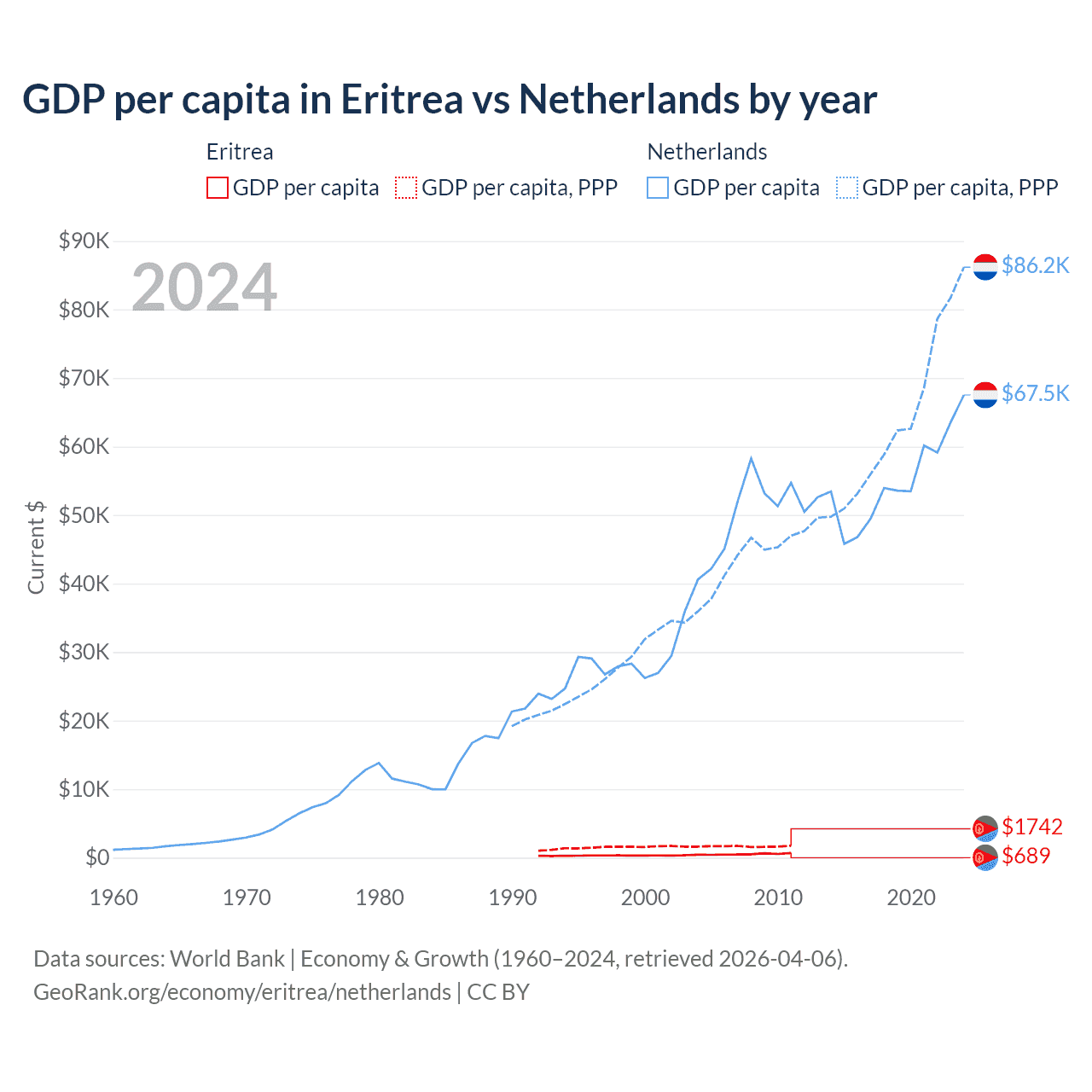 GDP per capita in Eritrea vs Netherlands by year