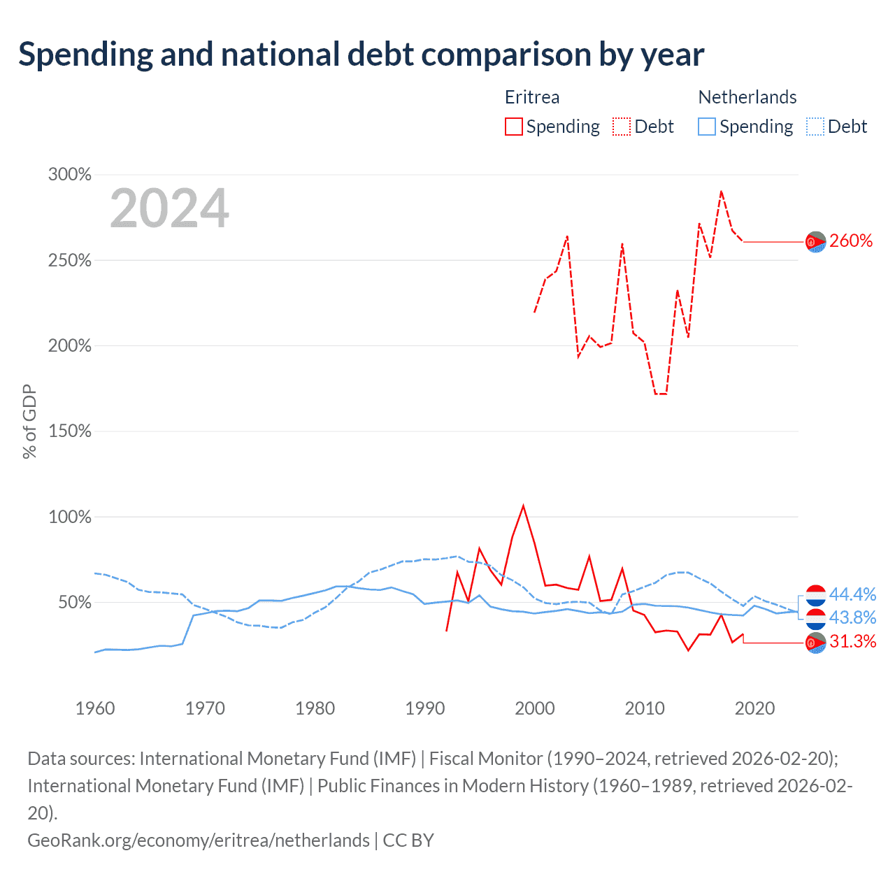 Eritrea has $3.54B in government debt (260.4% of GDP), compared to $532B (43.8% of GDP) in the Netherlands.