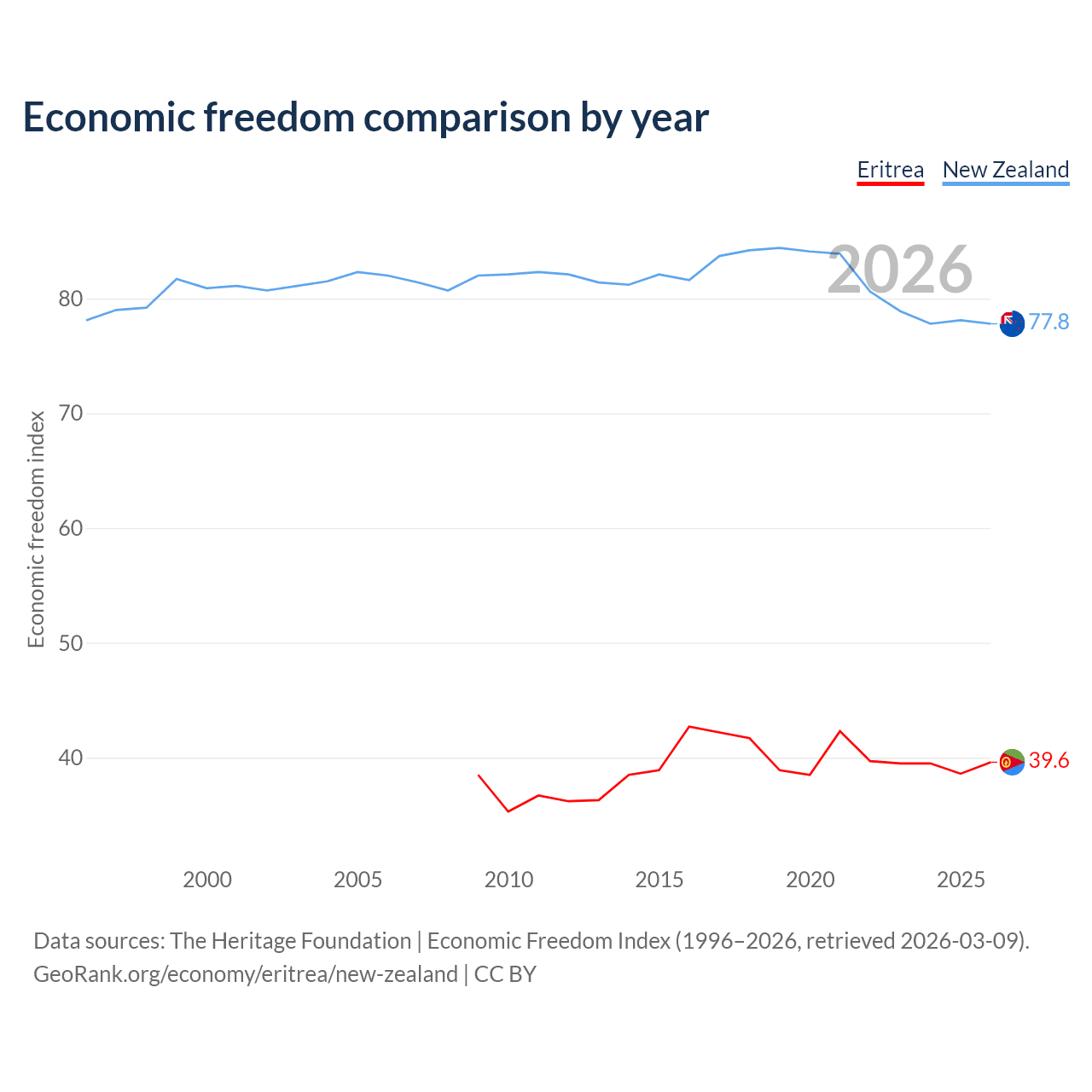 The Economic Freedom Index for Eritrea is 39.6, ranking 188/197, compared to 77.8 for New Zealand, ranking 13/197. The chart above displays a comparison of annual changes in economic freedom indexes.