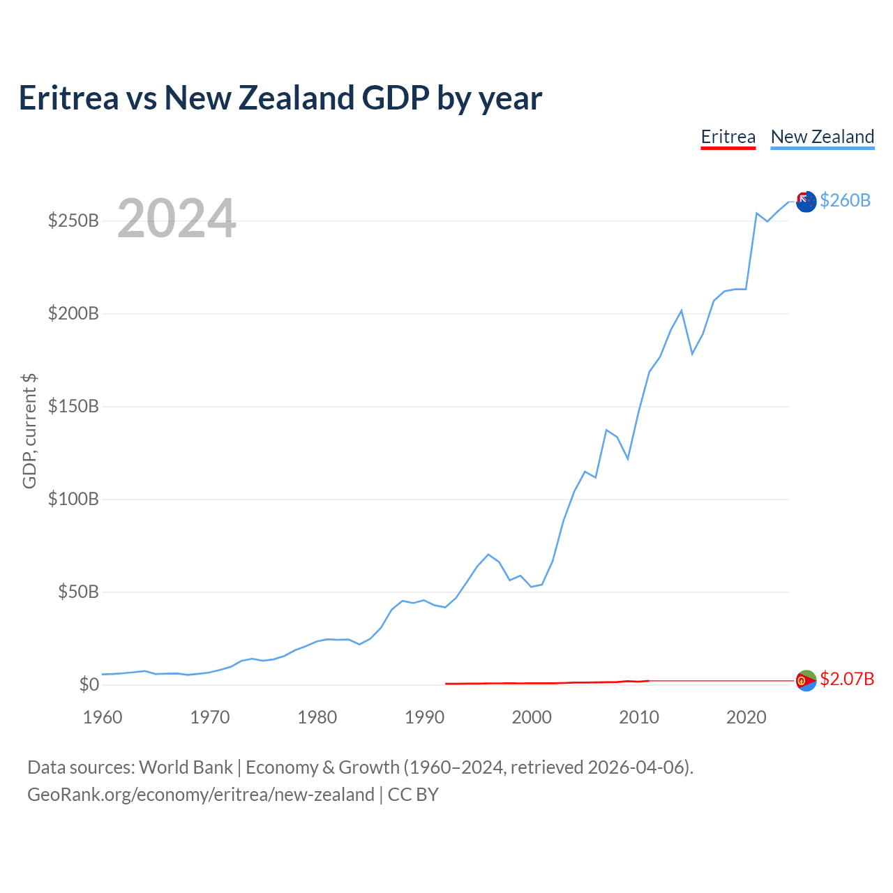 Eritrea has a GDP of $2.07B compared to $260B for New Zealand, ranking 179/197 and 52/197 by economy size, respectively.