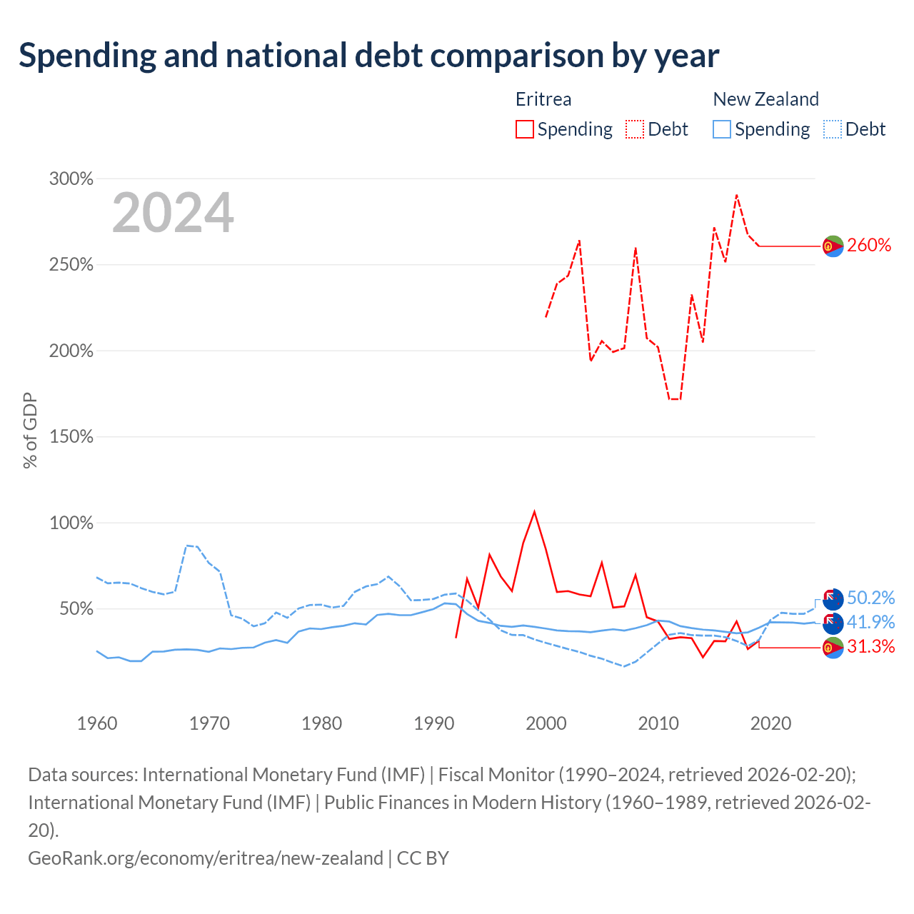 Eritrea has $3.54B in government debt (260.4% of GDP), compared to $131B (50.2% of GDP) in New Zealand.