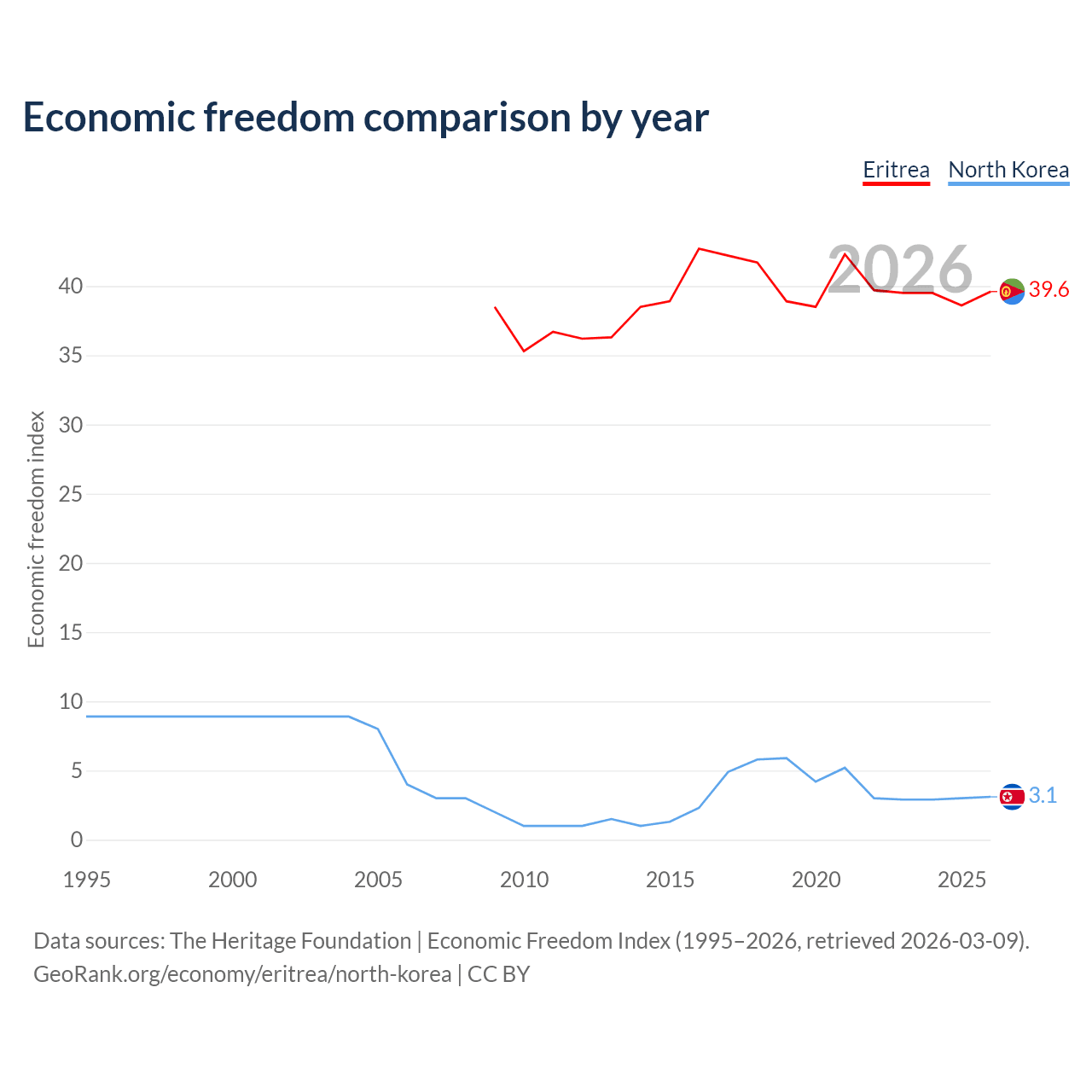 The Economic Freedom Index for Eritrea is 39.6, ranking 188/197, compared to 3.1 for North Korea, ranking 197/197. The chart above displays a comparison of annual changes in economic freedom indexes.