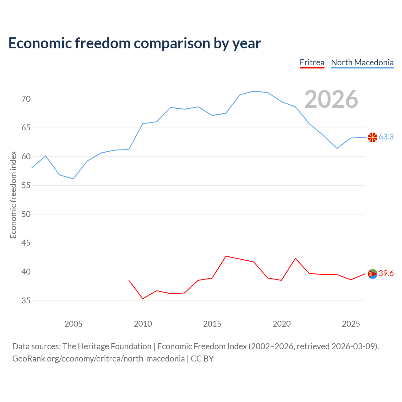 The Economic Freedom Index for Eritrea is 39.6, ranking 188/197, compared to 63.3 for North Macedonia, ranking 81/197. The chart above displays a comparison of annual changes in economic freedom indexes.