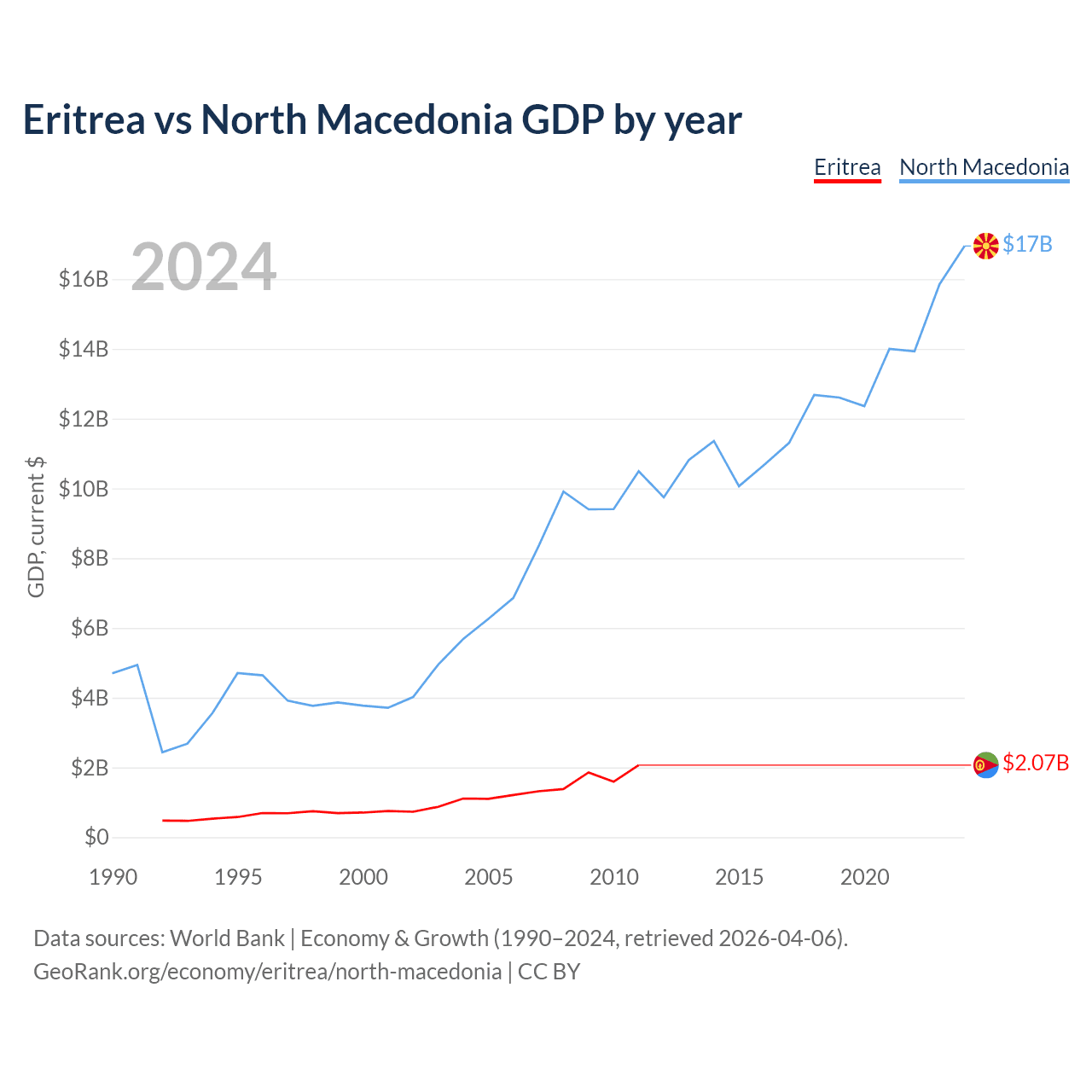 Eritrea has a GDP of $2.07B compared to $17B for North Macedonia, ranking 179/197 and 138/197 by economy size, respectively.