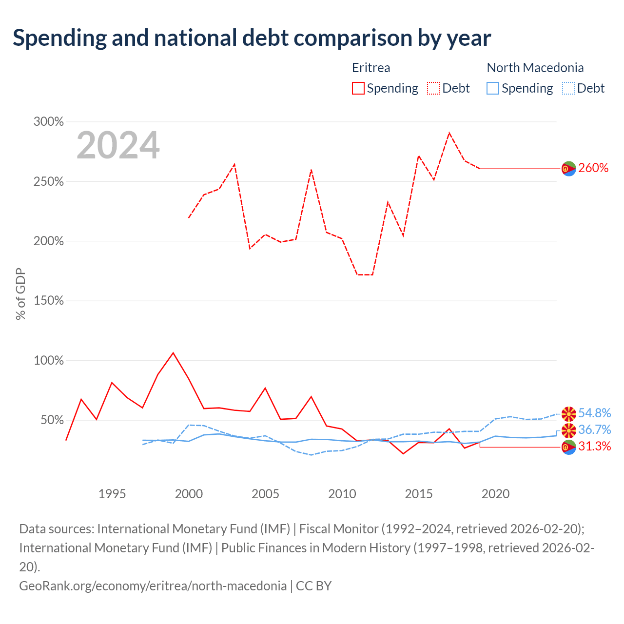 Eritrea has $3.54B in government debt (260.4% of GDP), compared to $9.3B (54.8% of GDP) in North Macedonia.