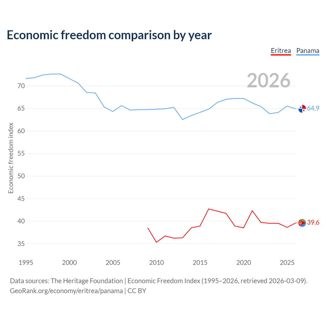 The Economic Freedom Index for Eritrea is 39.6, ranking 188/197, compared to 64.9 for Panama, ranking 70/197. The chart above displays a comparison of annual changes in economic freedom indexes.