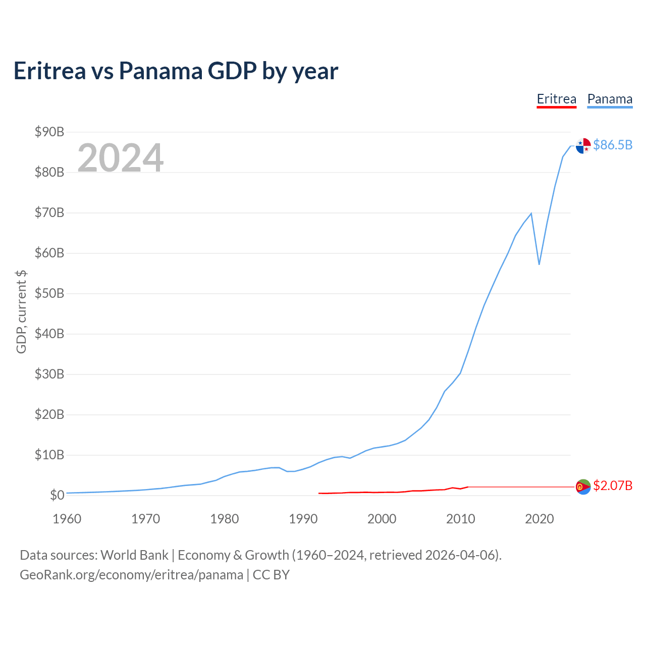 Eritrea has a GDP of $2.07B compared to $86.5B for Panama, ranking 179/197 and 78/197 by economy size, respectively.