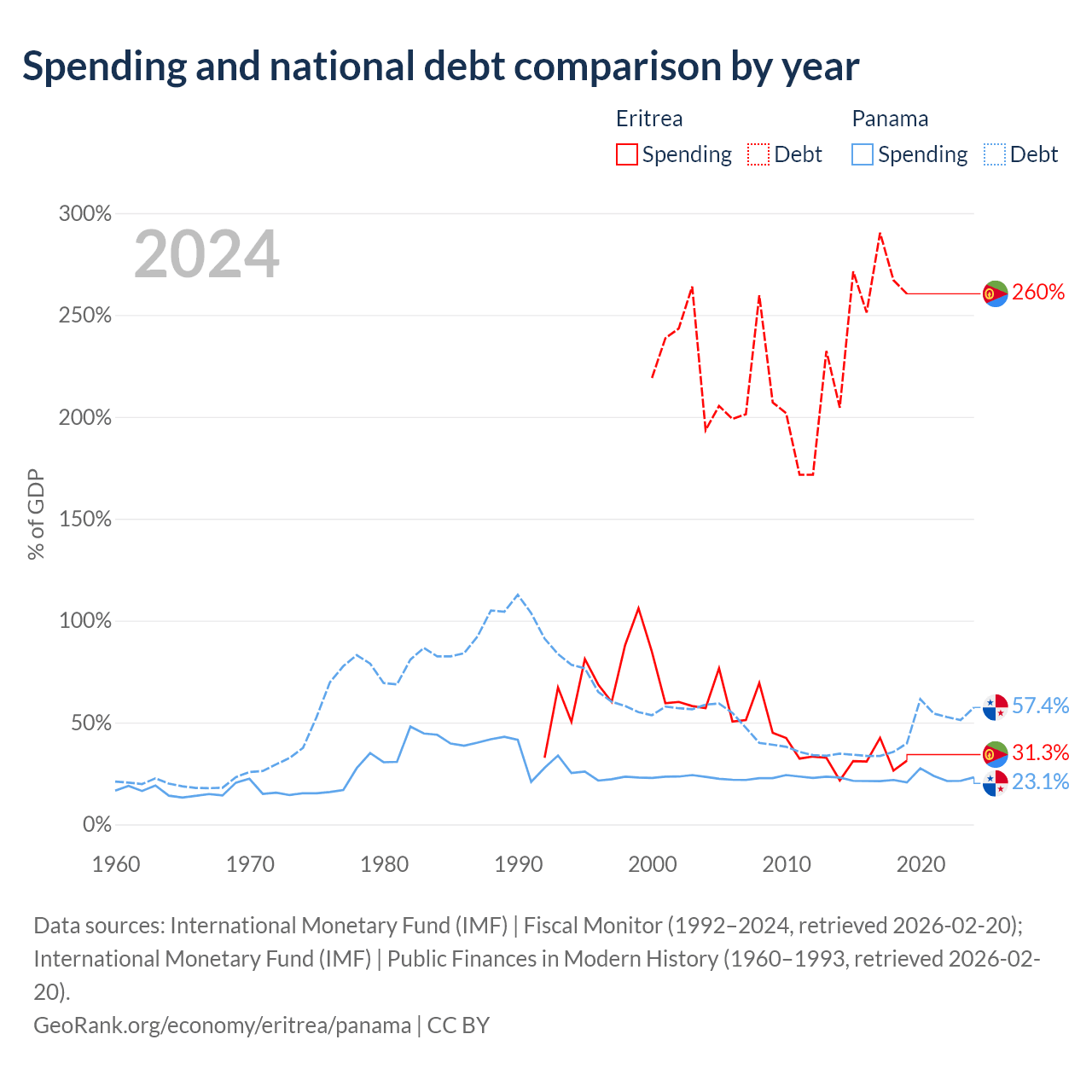 Eritrea has $3.54B in government debt (260.4% of GDP), compared to $49.6B (57.4% of GDP) in Panama.