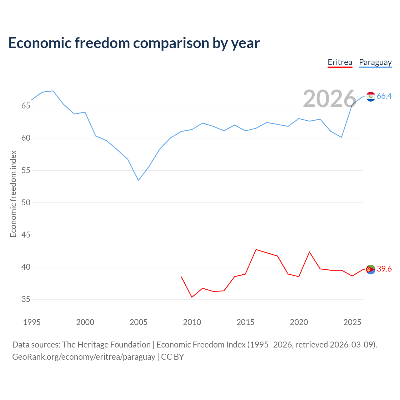 The Economic Freedom Index for Eritrea is 39.6, ranking 188/197, compared to 66.4 for Paraguay, ranking 61/197. The chart above displays a comparison of annual changes in economic freedom indexes.