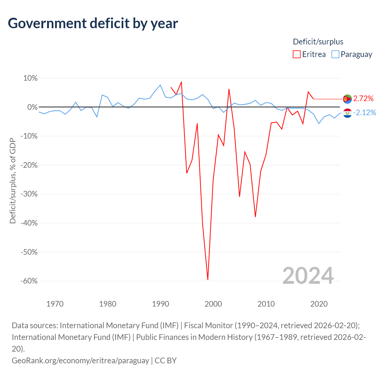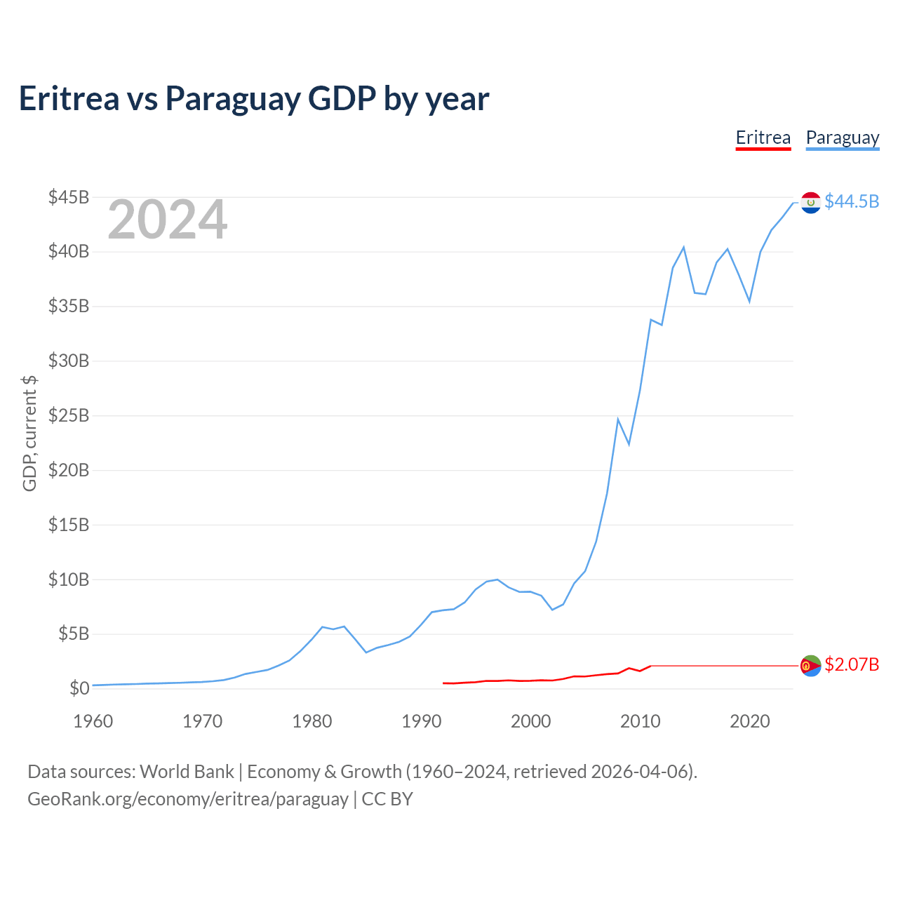Eritrea has a GDP of $2.07B compared to $44.5B for Paraguay, ranking 179/197 and 98/197 by economy size, respectively.