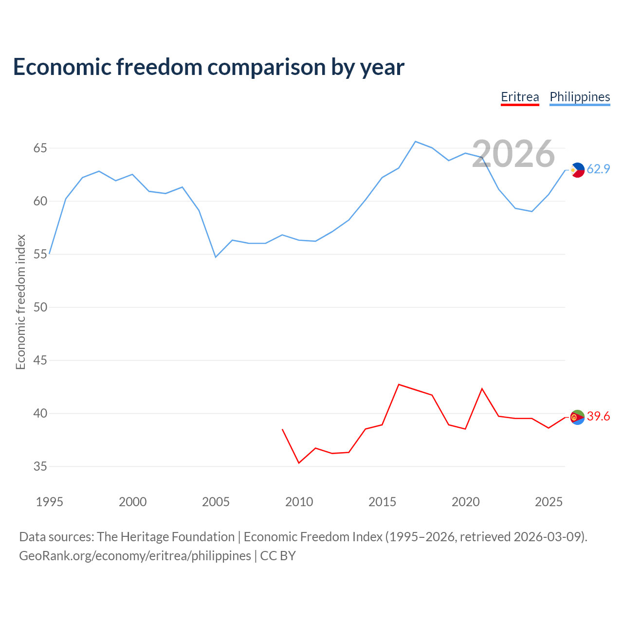 The Economic Freedom Index for Eritrea is 39.6, ranking 188/197, compared to 62.9 for the Philippines, ranking 85/197. The chart above displays a comparison of annual changes in economic freedom indexes.