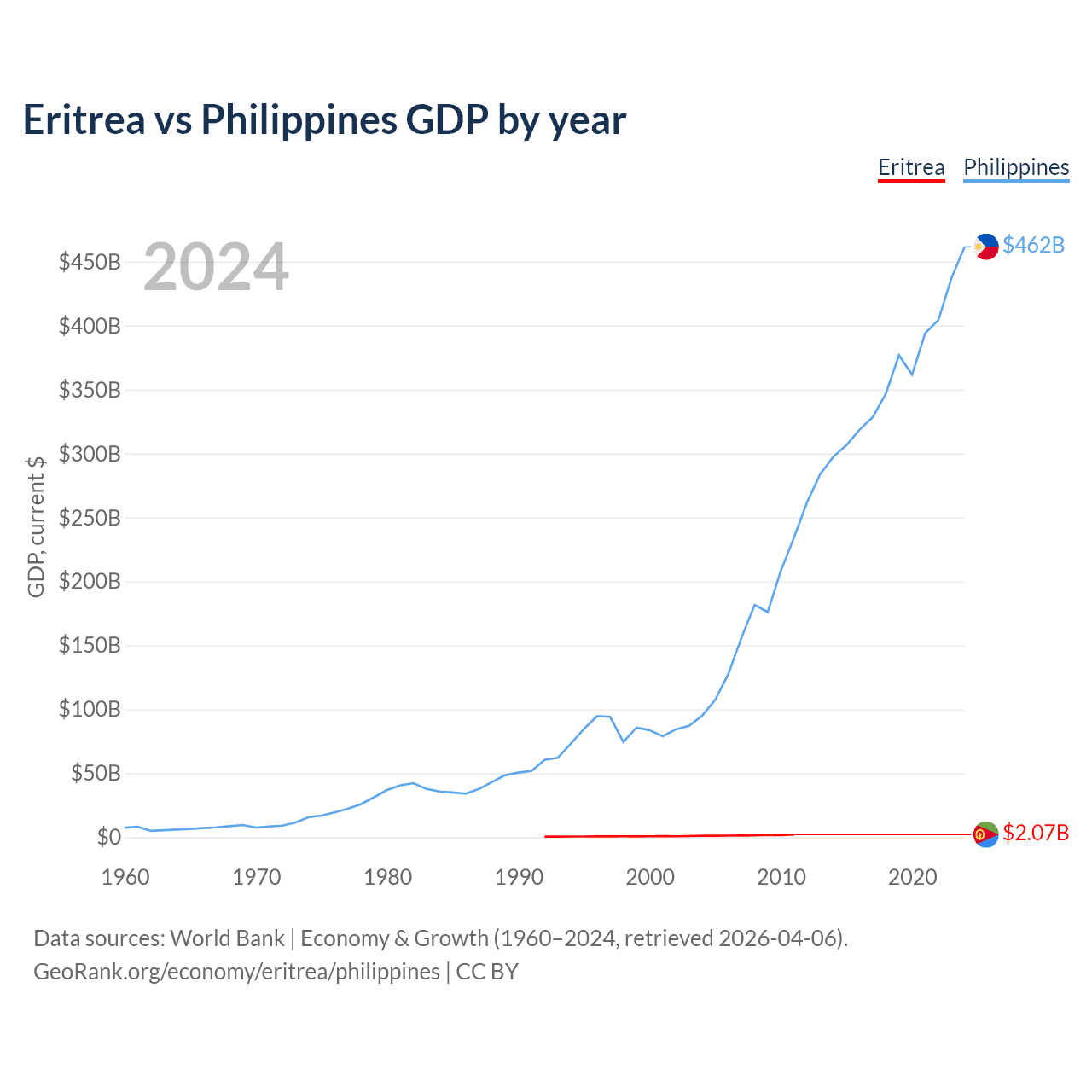 Eritrea has a GDP of $2.07B compared to $462B for the Philippines, ranking 179/197 and 35/197 by economy size, respectively.