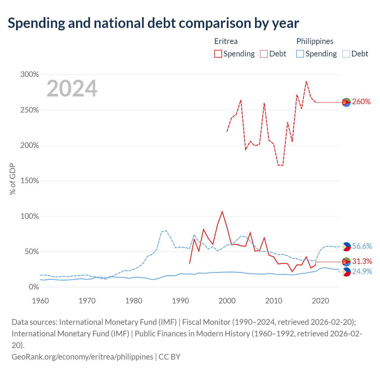 Eritrea has $3.54B in government debt (260.4% of GDP), compared to $261B (56.6% of GDP) in the Philippines.