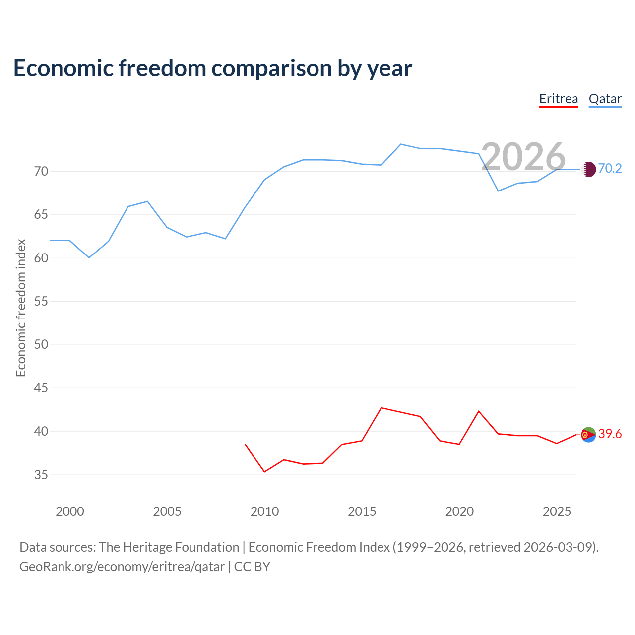 The Economic Freedom Index for Eritrea is 39.6, ranking 188/197, compared to 70.2 for Qatar, ranking 37/197. The chart above displays a comparison of annual changes in economic freedom indexes.