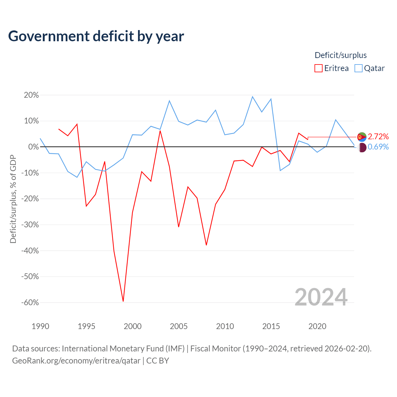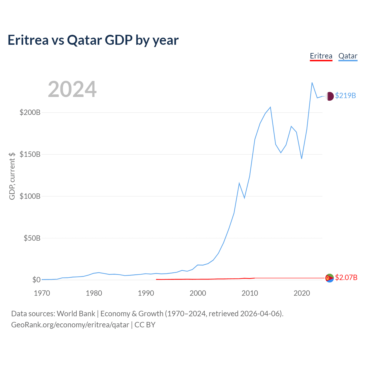 Eritrea has a GDP of $2.07B compared to $219B for Qatar, ranking 179/197 and 56/197 by economy size, respectively.