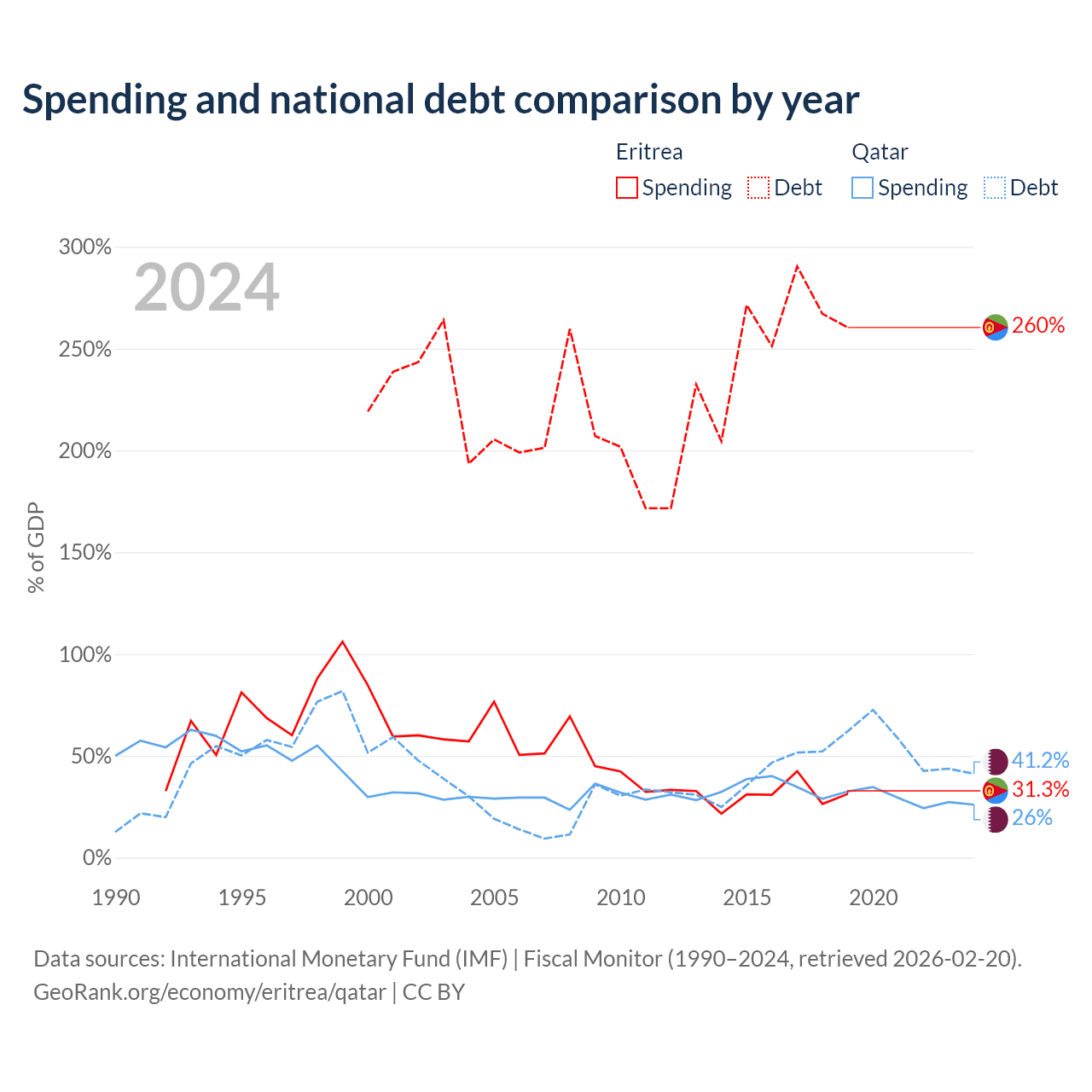 Eritrea has $3.54B in government debt (260.4% of GDP), compared to $90.2B (41.2% of GDP) in Qatar.