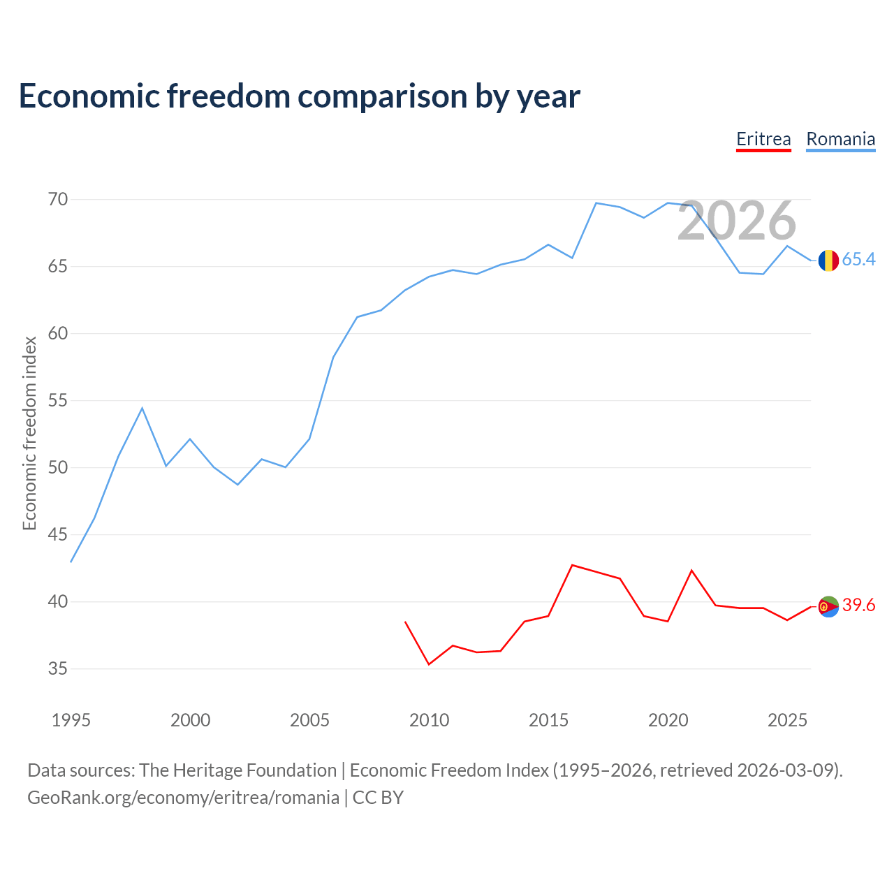 The Economic Freedom Index for Eritrea is 39.6, ranking 188/197, compared to 65.4 for Romania, ranking 64/197. The chart above displays a comparison of annual changes in economic freedom indexes.