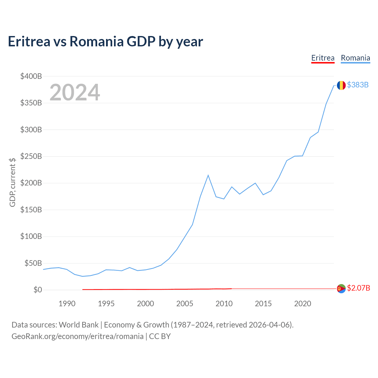 Eritrea has a GDP of $2.07B compared to $383B for Romania, ranking 179/197 and 42/197 by economy size, respectively.