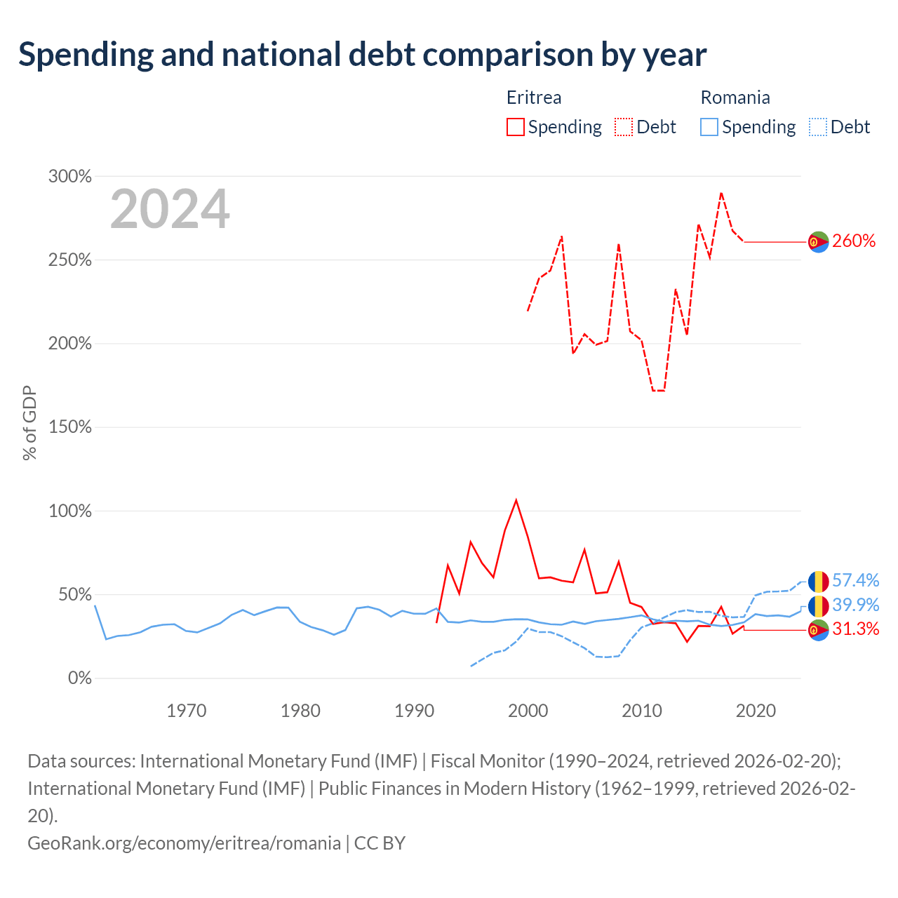 Eritrea has $3.54B in government debt (260.4% of GDP), compared to $220B (57.4% of GDP) in Romania.